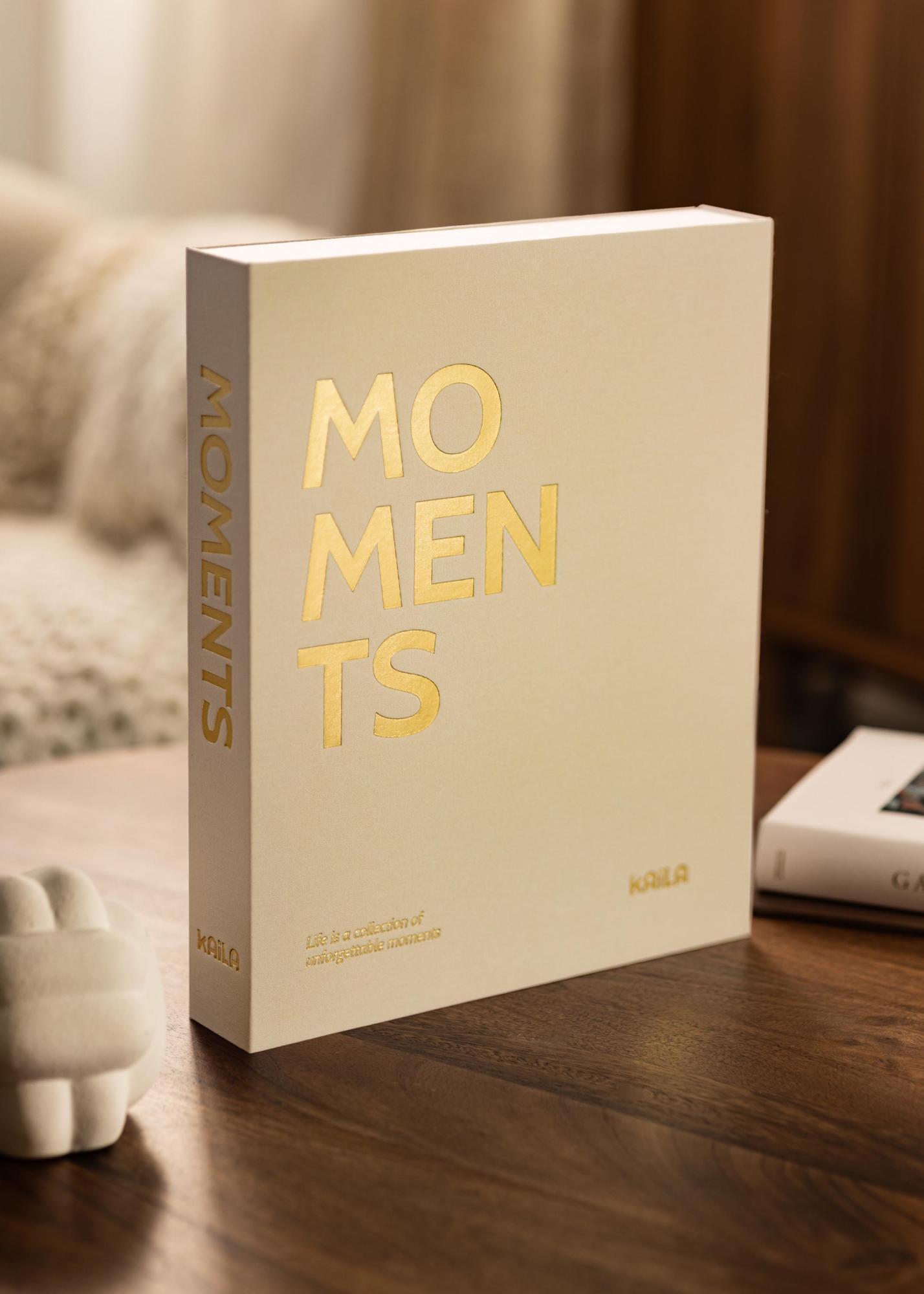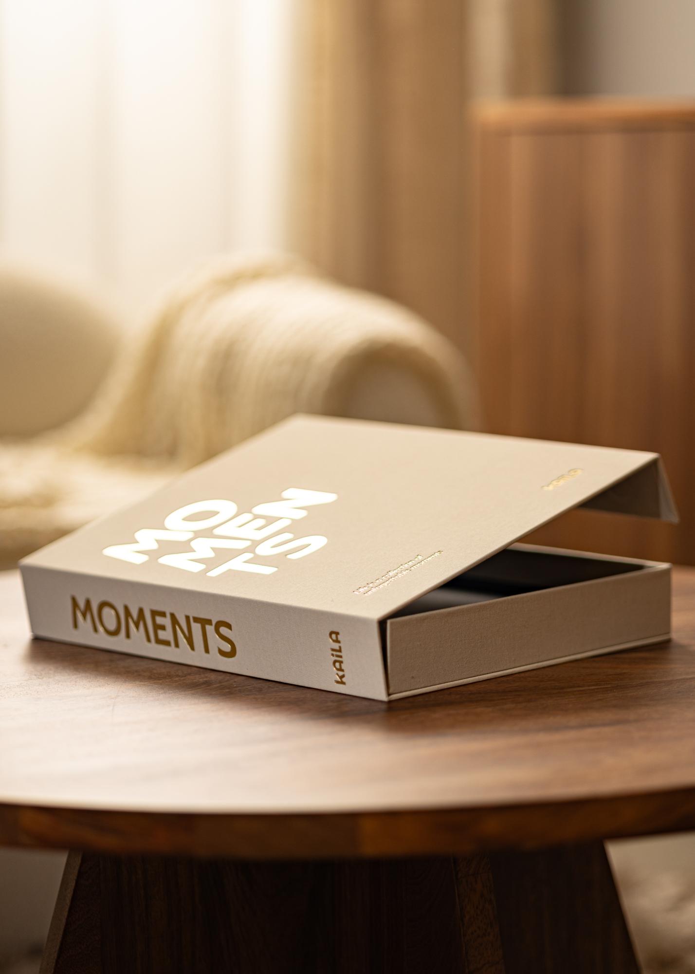 Το φωτογραφικό άλμπουμ είναι σχεδιασμένο ως κουτί που μπορείτε να ανοίξετε για να έχετε πρόσβαση στις φωτογραφίες σας. Το εξώφυλλο είναι στολισμένο με ύφασμα στο χρώμα της κρέμας, κάτι που δίνει μια αίσθηση πολυτέλειας. Στο μπροστινό και στο πλάι υπάρχει το κείμενο "MOMENTS". Στην αριστερή γωνία στην κορυφή διακρίνεται ο όμορφος υπότιτλος "Η ζωή είναι μια συλλογή αξέχαστων στιγμών".