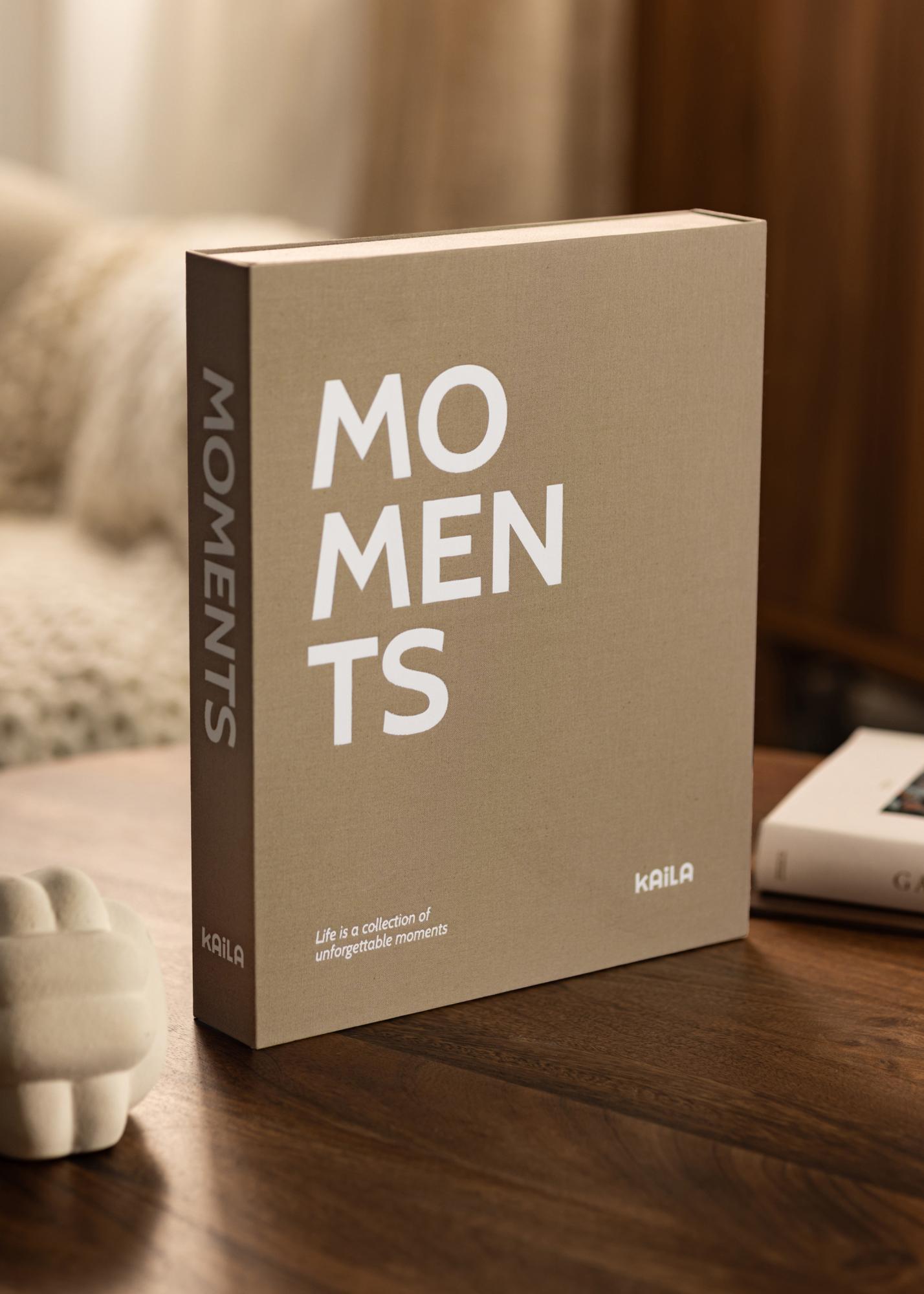 Το φωτογραφικό άλμπουμ είναι σχεδιασμένο σαν ένα κουτί που μπορείτε να ανοίξετε για να αποκτήσετε πρόσβαση στις φωτογραφίες σας. Το εξώφυλλο είναι διακοσμημένο με γκρι ύφασμα, που δίνει μια αίσθηση πολυτέλειας. Στο μπροστινό και στο πλαϊνό μέρος υπάρχει το κείμενο "MOMENTS". Στην αριστερή γωνία στην κορυφή εμφανίζεται ο όμορφος υπότιτλος "Η ζωή είναι μια συλλογή από αξέχαστες στιγμές".