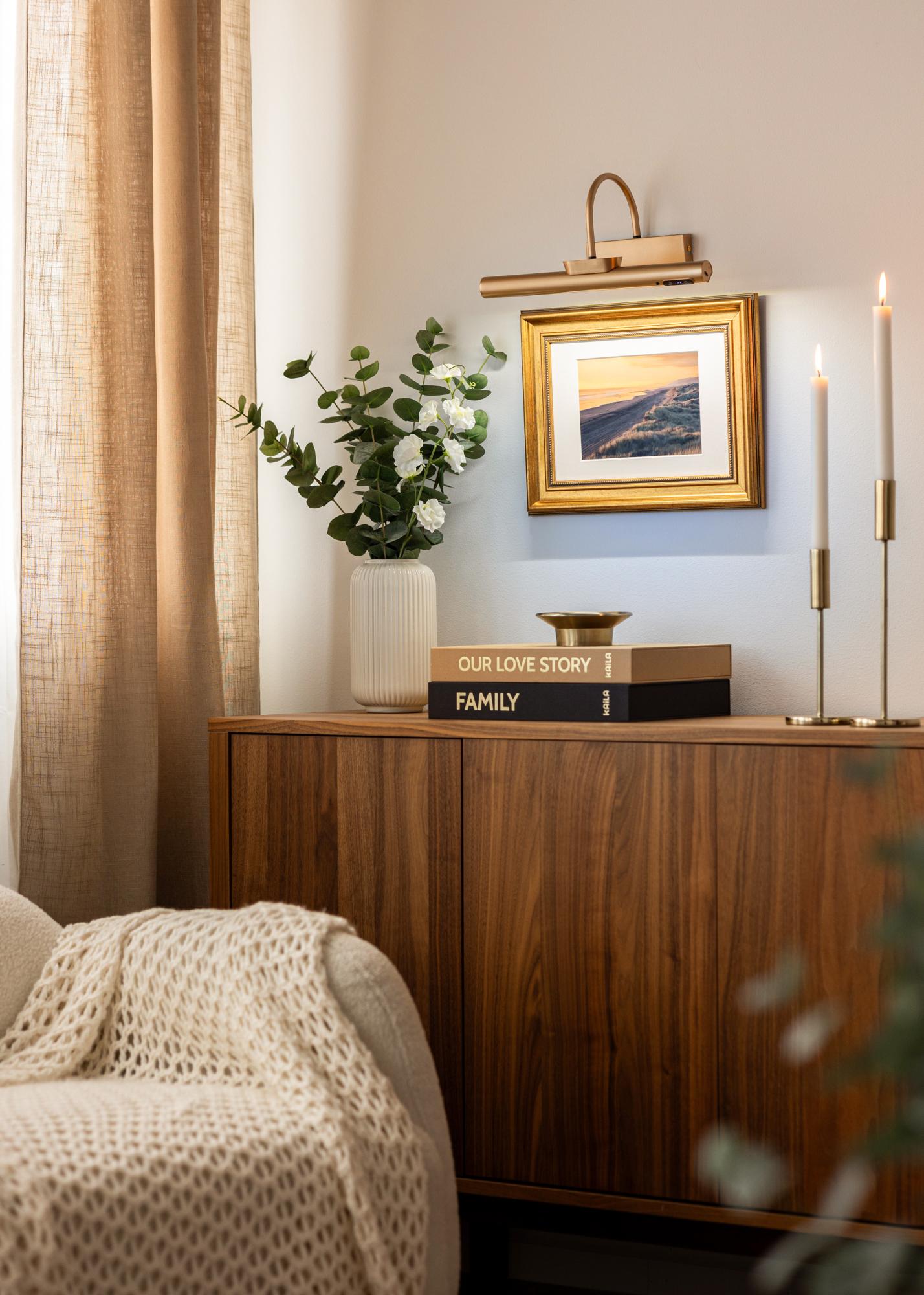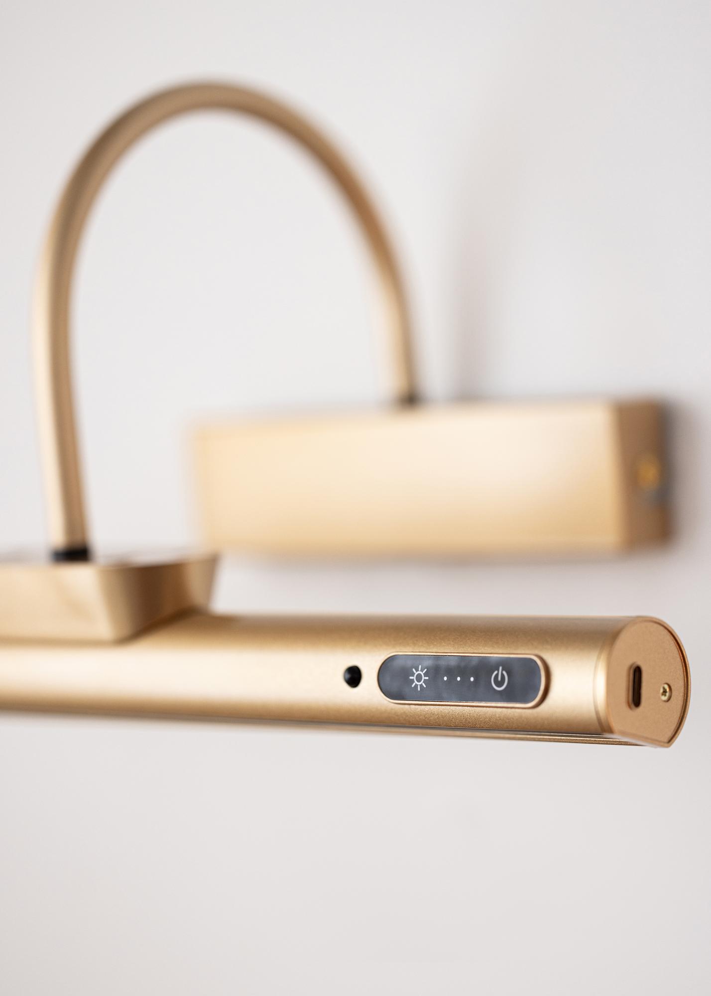 Ο φωτισμός πινάκων έχει βάθος 14 cm και μήκος 35 cm, καθιστώντας τον ιδανικό για φωτισμό πινάκων έως 60 cm σε πλάτος. Το κομψό χρυσό χρώμα προσφέρει μια πολυτελή και σοφιστικέ αίσθηση, ιδανική για να ταιριάζει σε κάθε είδους εσωτερικού χώρου. Η πηγή φωτός είναι ένας ενεργειακά αποδοτικός LED με ρυθμιζόμενη φωτεινότητα μεταξύ 262 και 300 lumens, παρέχοντας ένα ευχάριστο φως που αναδεικνύει τις εικόνες σας με έναν απαλό και φυσικό τρόπο.