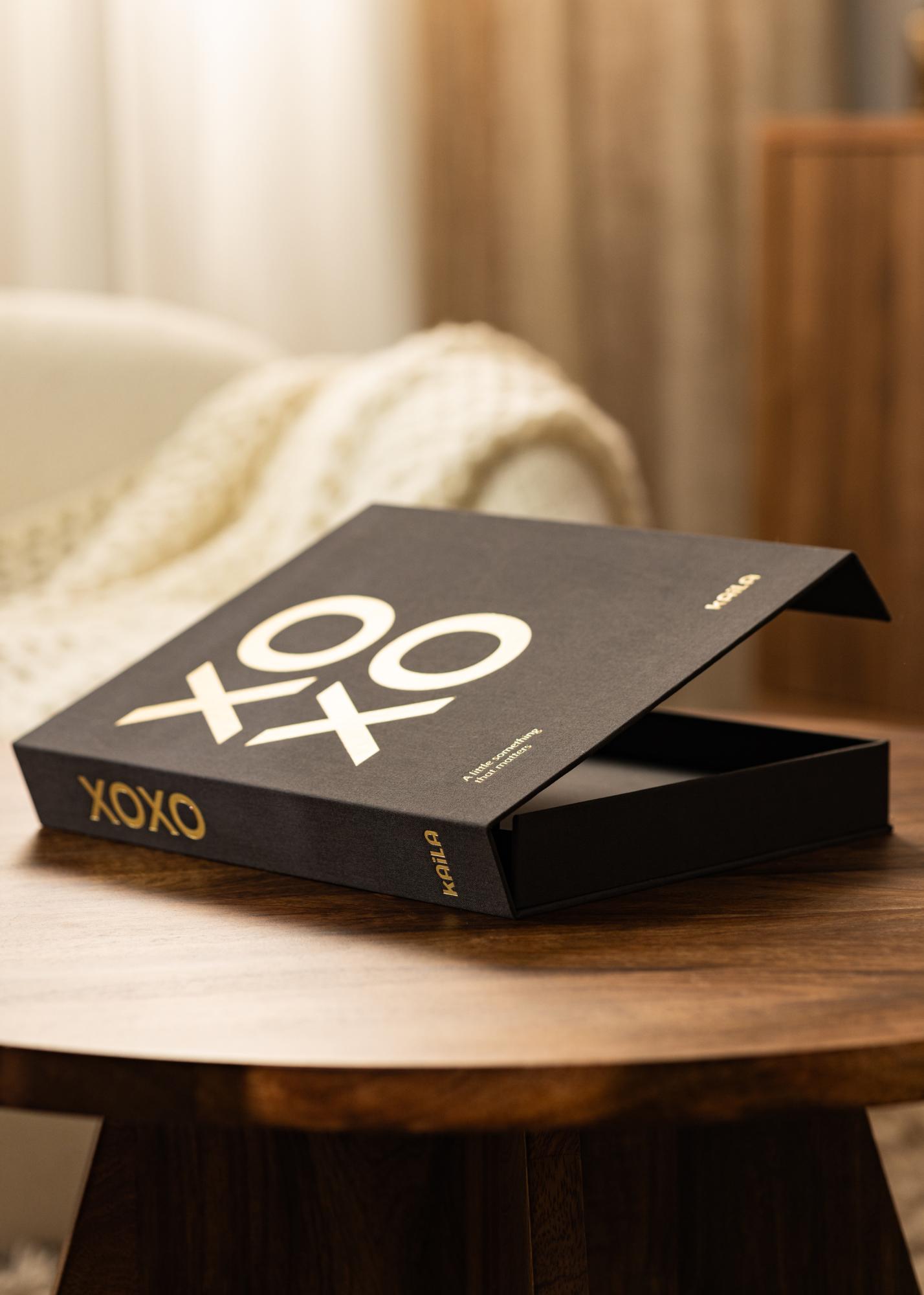Αυτό το κομψό άλμπουμ φωτογραφιών έχει σχεδιαστεί ως ένα μοντέρνο Coffee Table Book και για αυτόν τον λόγο ονομάζεται επίσης άλμπουμ φωτογραφιών Coffee Table. Το εξώφυλλο είναι κομψά καλυμμένο με μαύρο ύφασμα και στο μπροστινό και το πίσω μέρος του άλμπουμ υπάρχει μια εκτύπωση σε χρυσό χρώμα με τον γνωστό χαιρετισμό αποχαιρετισμού "XOXO" που σημαίνει φιλιά και αγκαλιές. Αυτή η μοντέρνα τίτλος συμπληρώνεται επίσης με έναν υπότιτλο που λέει "A little something that matters" και είναι εκτυπωμένος κάτω αριστερά στη γωνία του άλμπουμ. Είναι ένα πολύ κομψό άλμπουμ φωτογραφιών με διαφορετικό και παιχνιδιάρικο σχεδιασμό που σίγουρα ξεχωρίζει από το πλήθος.