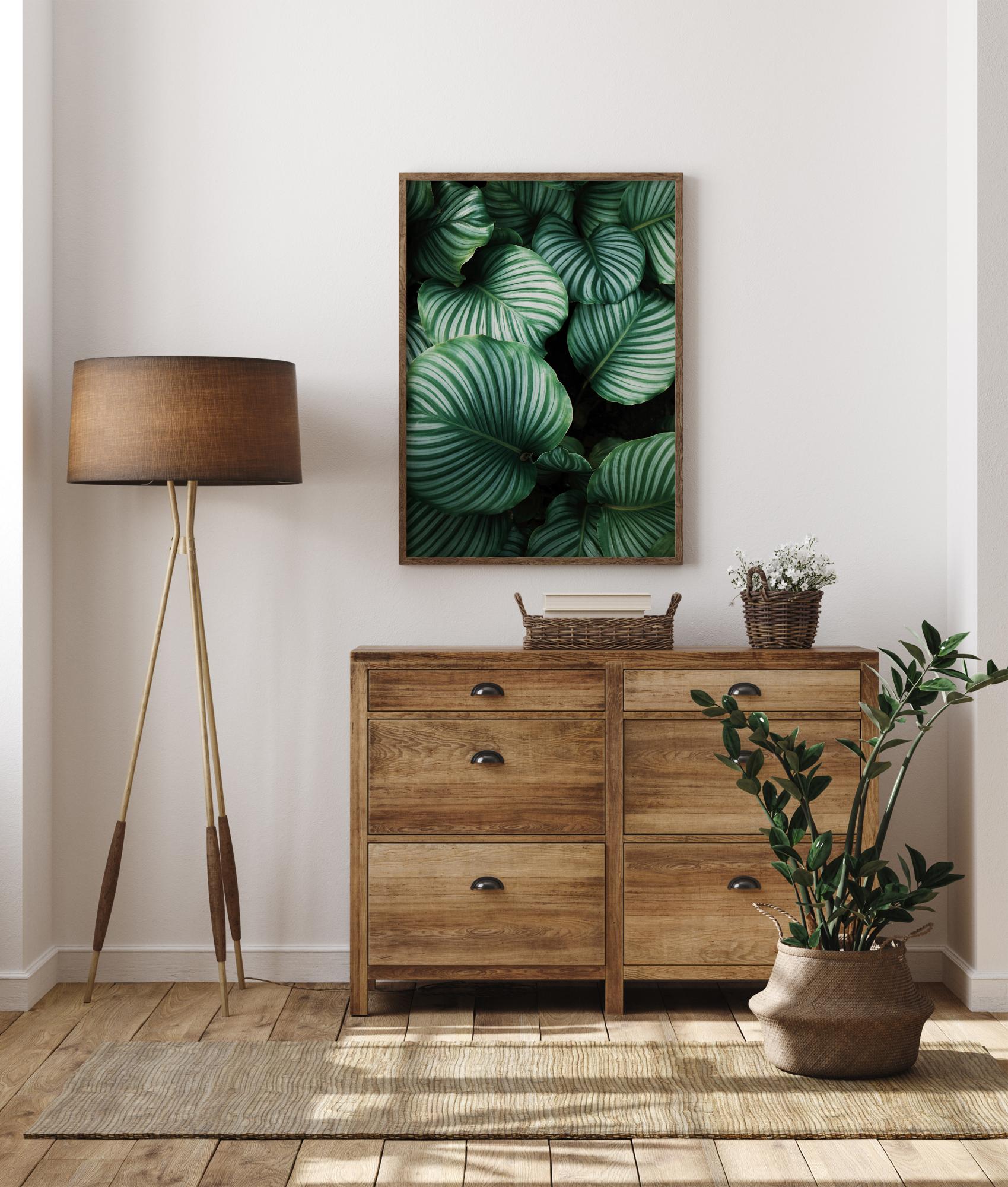 Μια όμορφη αφίσα σε προοπτική πτηνού με σκοτεινά, πράσινα φύλλα από μια καλαθέα. Το ηλιακό φως ακτινοβολεί στα φύλλα και δημιουργεί έναν διάχυτο φωτισμό. Διάφορες αποχρώσεις του πράσινου δημιουργούν μια έντονη ατμόσφαιρα, καθιστώντας αυτή την εικόνα τέλεια για να κρεμαστεί περιτριγυρισμένη από φυτά σε ένα σαλόνι.