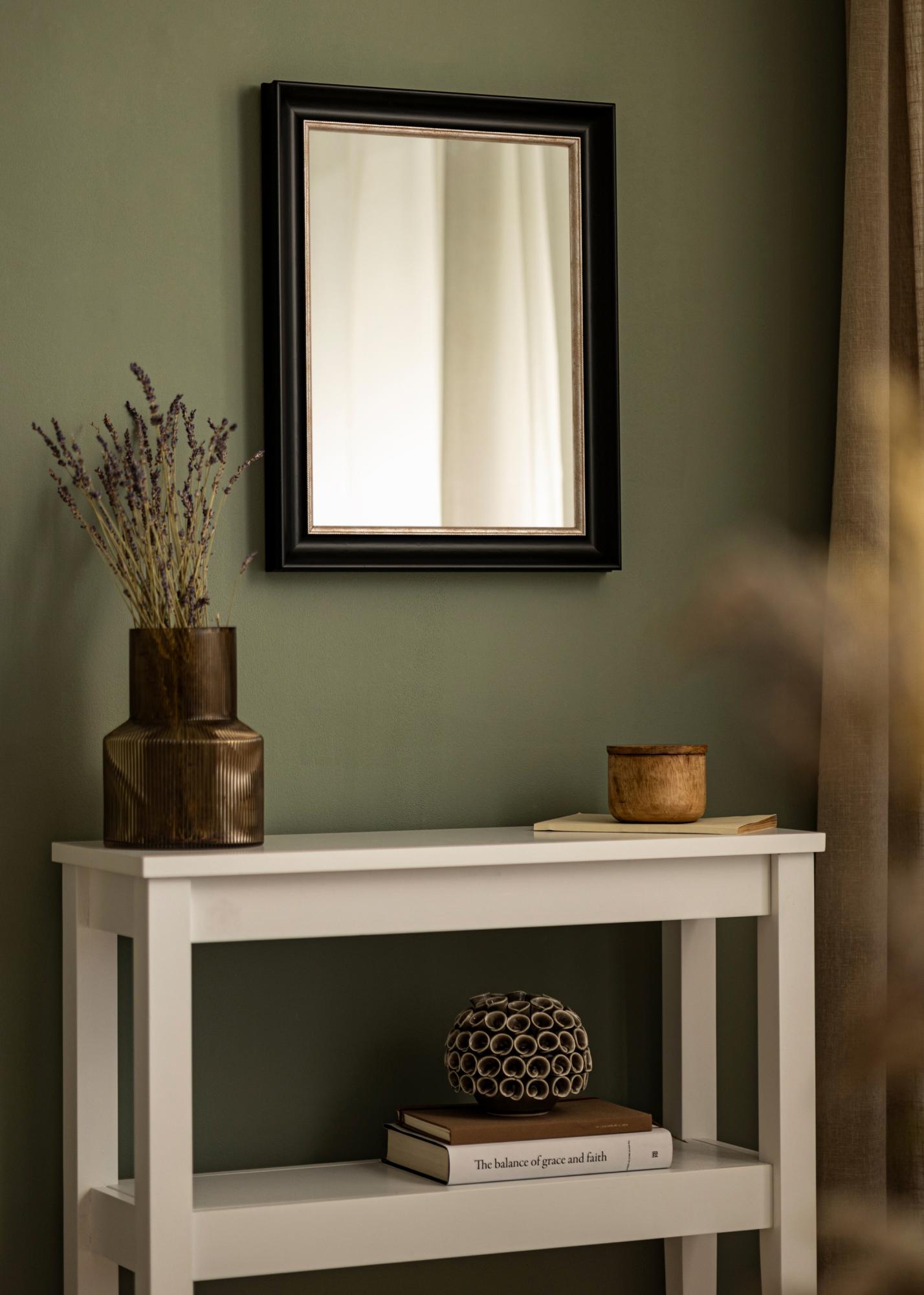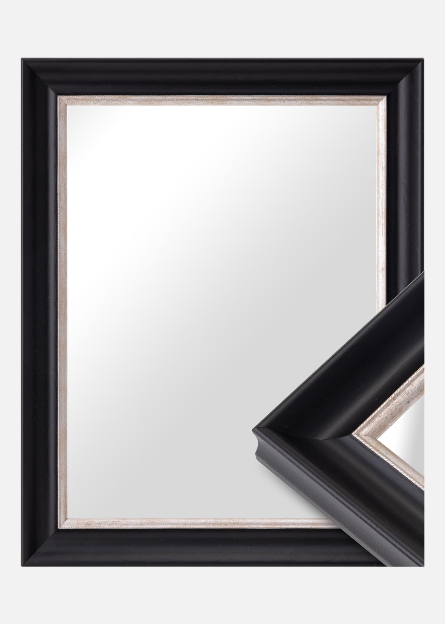 Πολυτελής καθρέφτης σε οποιοδήποτε μέγεθος με μαύρο κλασικό προφίλ. Πλησιέστερα στο μοτίβο υπάρχει μια κομψή ασημί άκρη που προσδίδει επιπλέον λάμψη στον καθρέφτη.