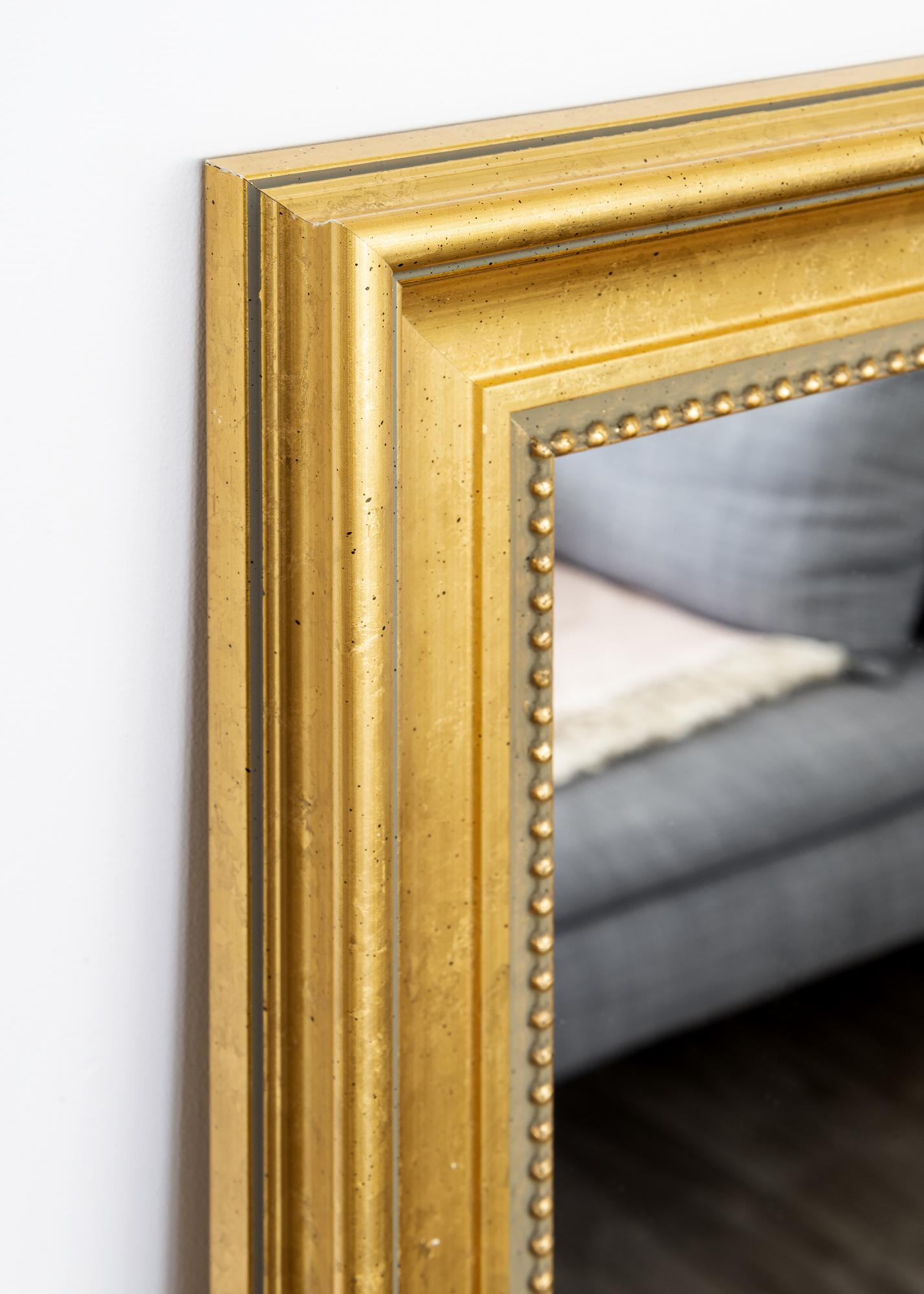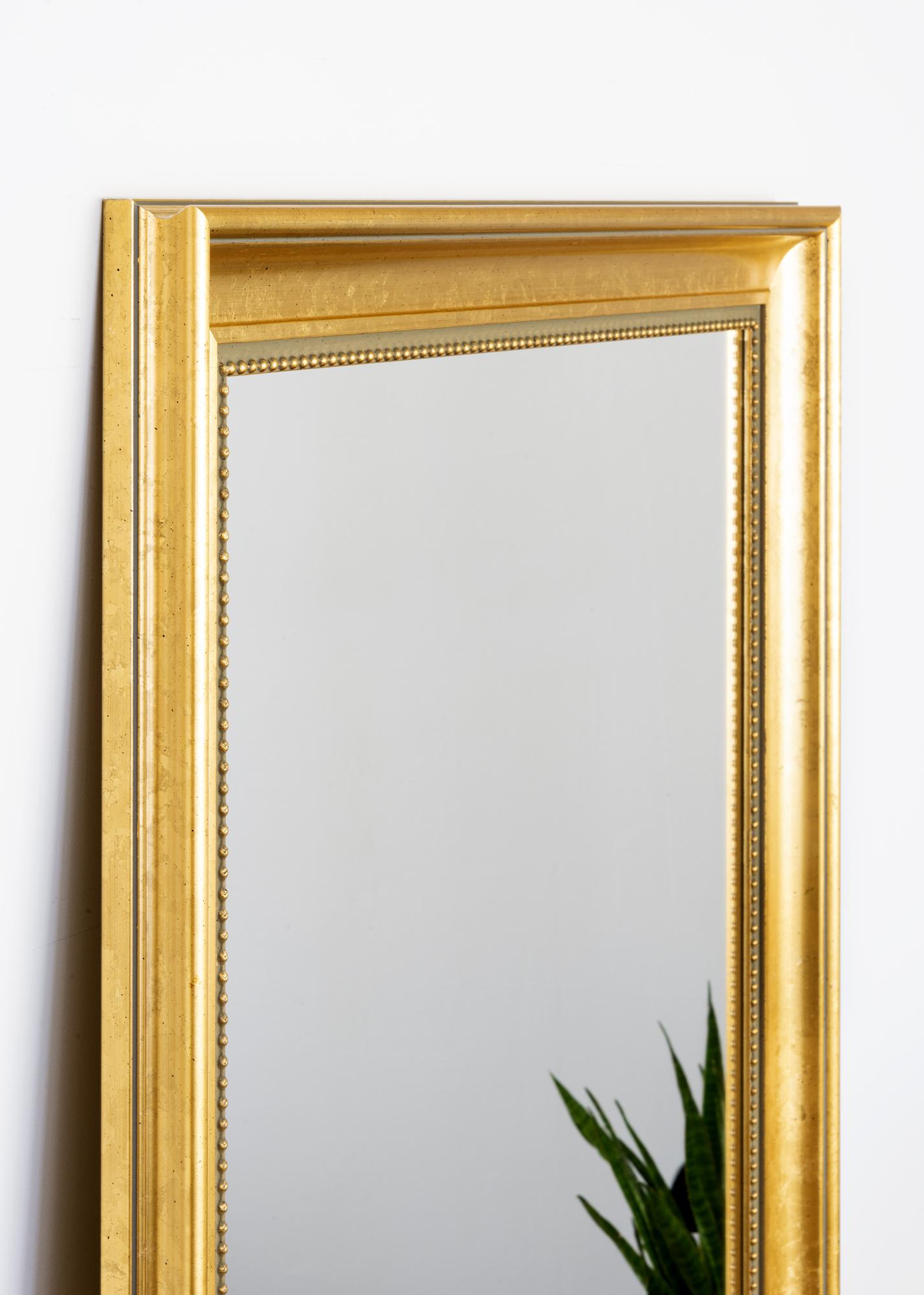Αποκτήστε έναν κομψό καθρέφτη και κάντε το εσωτερικό του χωλ, του σαλονιού ή του μπάνιου έξτρα πολυτελές. Αυτός ο στυλάτος καθρέφτης διατίθεται σε αρκετά μεγέθη ώστε να βρείτε εύκολα έναν που ταιριάζει ακριβώς για την ανάγκη σας. Η κορνίζα του καθρέφτη έχει μια κλασική σχεδίαση με μια φαρδιά κορνίζα και ένα διακριτικό μοτίβο μαργαριταριών κοντά στο γυαλί. Το ξύλο προέρχεται από βιώσιμη δασοκομία και είναι βαμμένο σε μια όμορφη χρυσή απόχρωση.