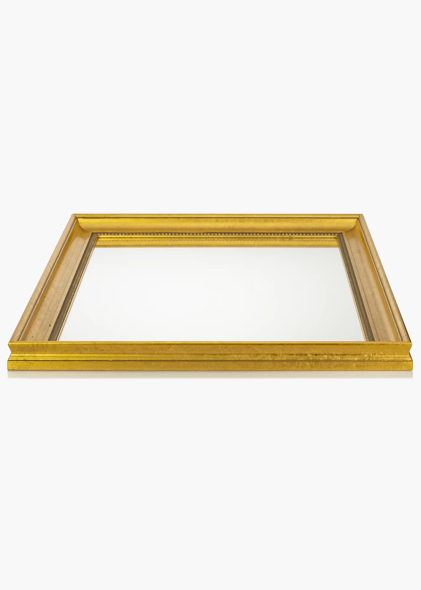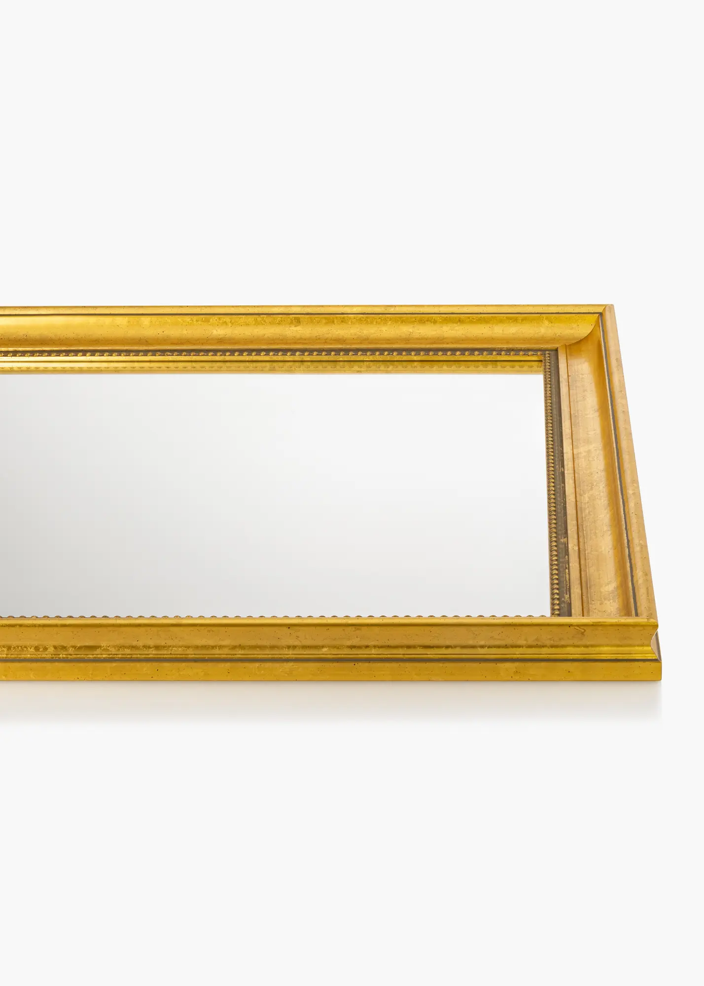 Αποκτήστε έναν κομψό καθρέφτη και κάντε το εσωτερικό του χολ, του καθιστικού ή του μπάνιου σας εξαιρετικά πολυτελές. Αυτός ο κομψός καθρέφτης διατίθεται σε διάφορα μεγέθη, ώστε να βρείτε εύκολα ένα που να ταιριάζει στις ανάγκες σας. Η κορνίζα του καθρέφτη έχει κλασικό σχέδιο με πλατιά κορνίζα και διακριτικό μοτίβο από μαργαριτάρια κοντά στο γυαλί. Το ξύλο προέρχεται από βιώσιμη δασοκομία και είναι βαμμένο σε μια όμορφη απόχρωση χρυσού.
