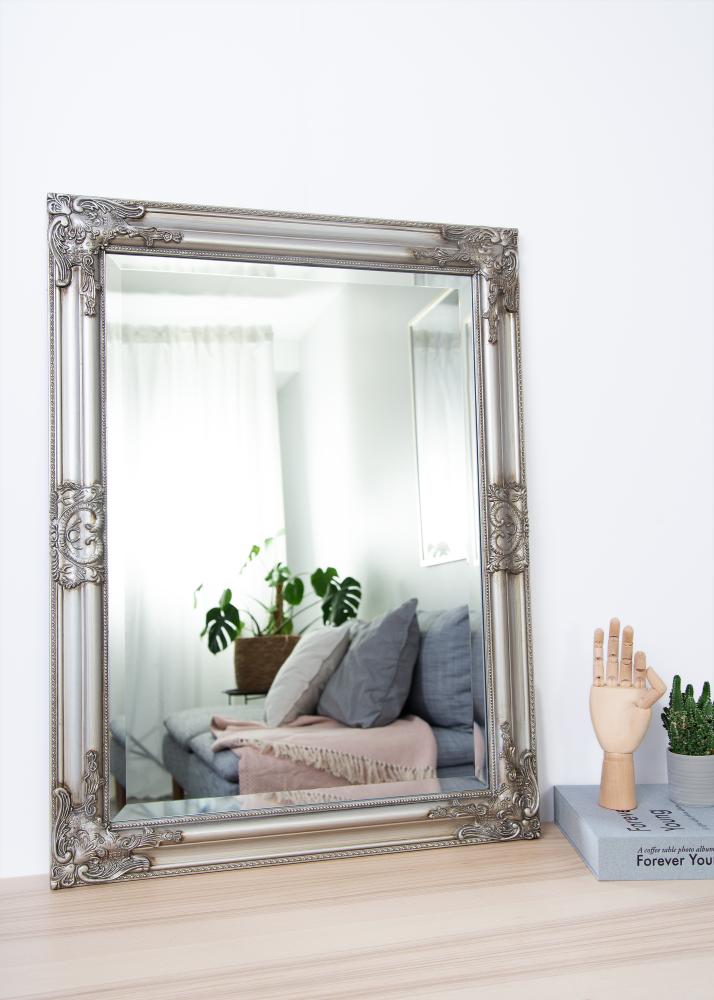 Η σειρά καθρεφτών Bologna Ασήμι έχει λατινικό σχεδιασμό με πλούσια διακόσμηση στις γωνίες και στα κεντρικά σημεία των πλευρών του πλαισίου. Λίγο στενότερο πλαίσιο από πολλούς άλλους καθρέπτες σε αυτό το στυλ. Το πλαίσιο είναι κατασκευασμένο από ξύλο, και η διακόσμηση έχει χυτευθεί σε γύψο πριν εφαρμοστεί στο πλαίσιο.
