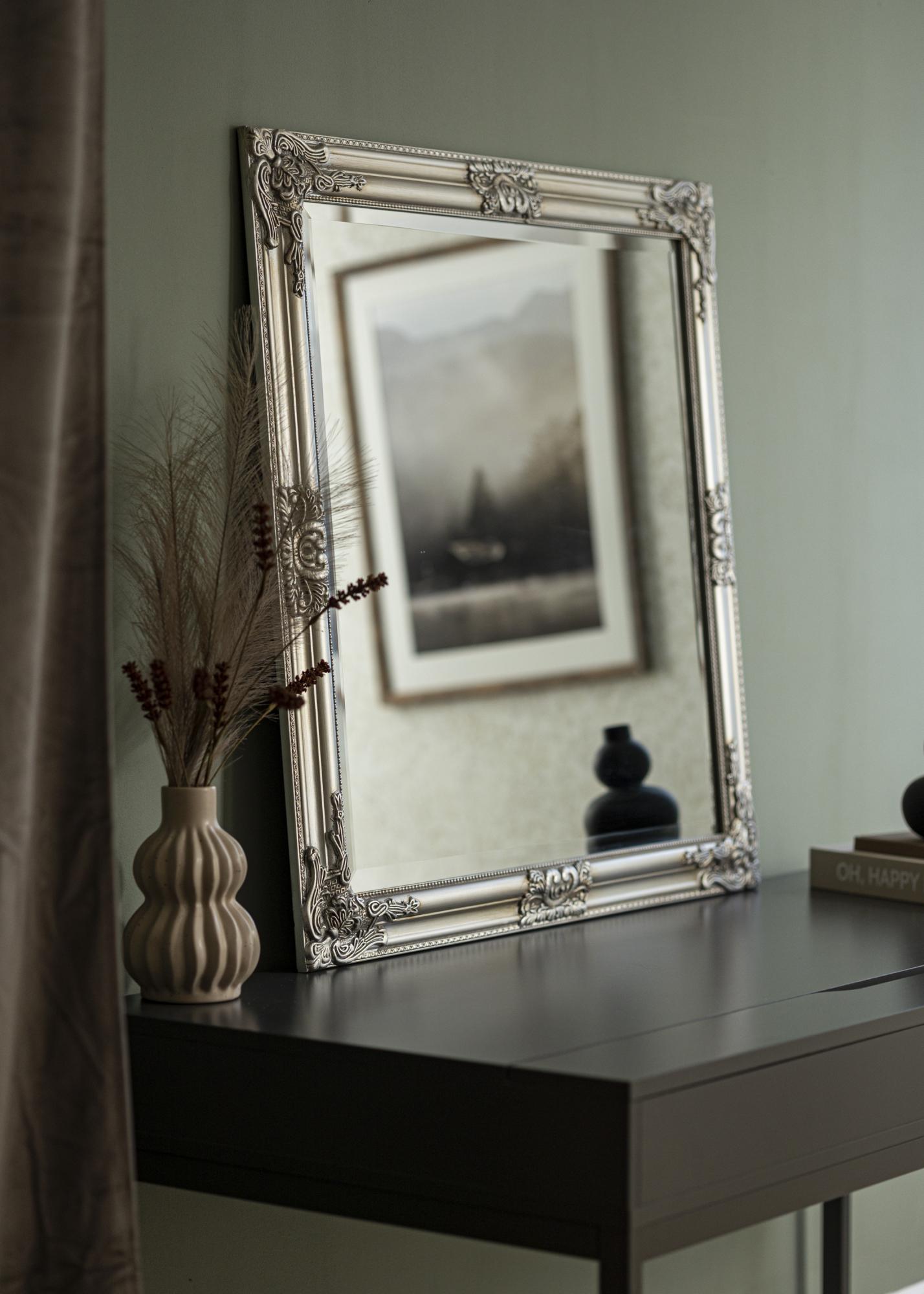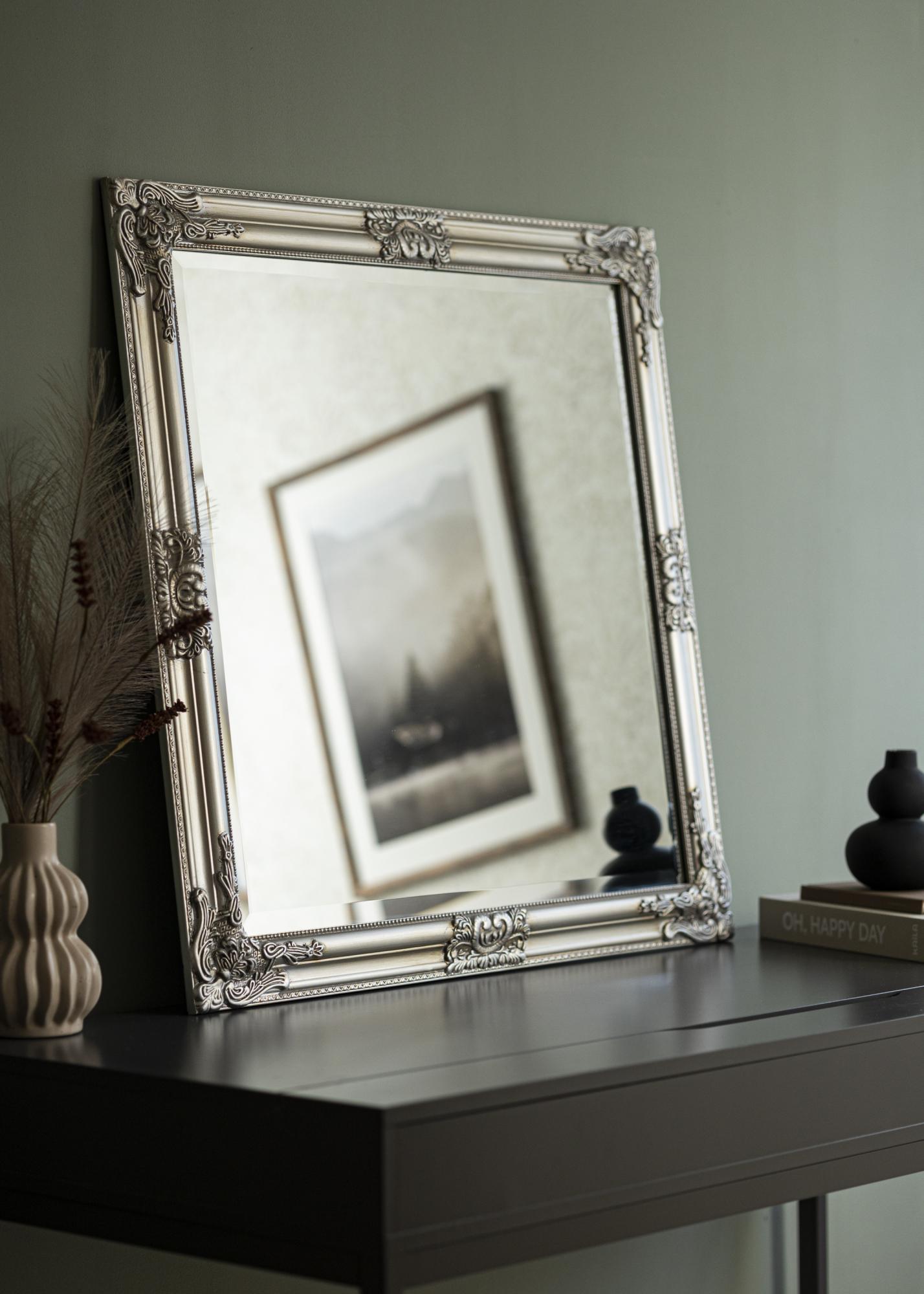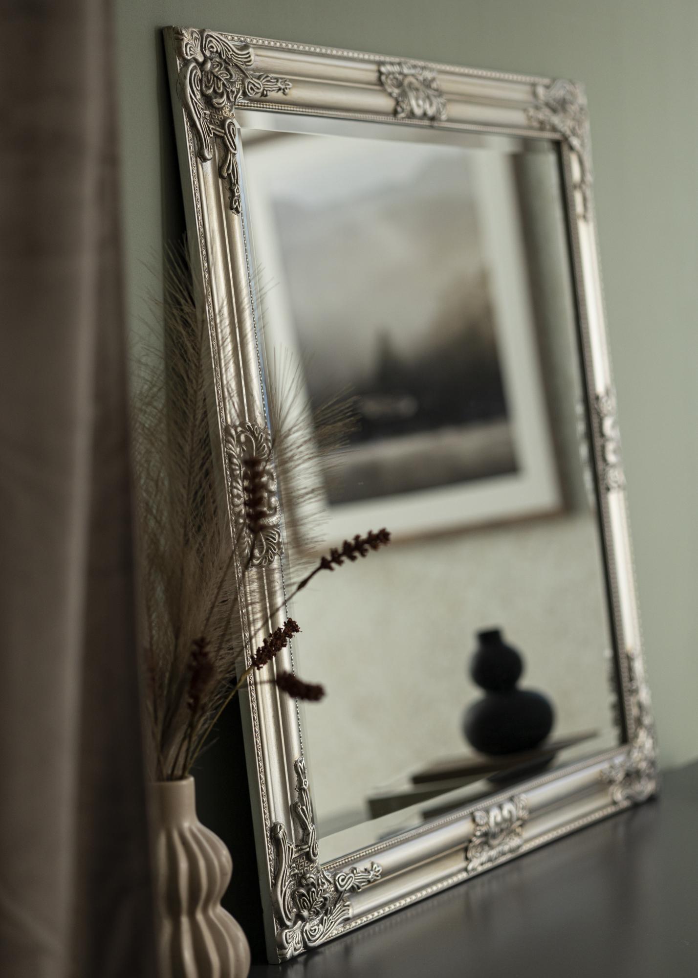 Το πλαίσιο αυτού του καθρέφτη είναι πραγματικά εντυπωσιακό, πλούσιο σε λεπτομερή στολίδια σε στυλ μπαρόκ που προσθέτουν μια πολυτελή και ιστορική αίσθηση στο δωμάτιο. Η τετράγωνη μορφή προσδίδει μια συμμετρική και ισορροπημένη αισθητική που συμπληρώνει τα περισσότερα διακοσμητικά στυλ. Η ασημένια απόχρωση του πλαισίου ενισχύει την κομψή του εμφάνιση και τον καθιστά ένα πολυλειτουργικό στοιχείο στο σπίτι.