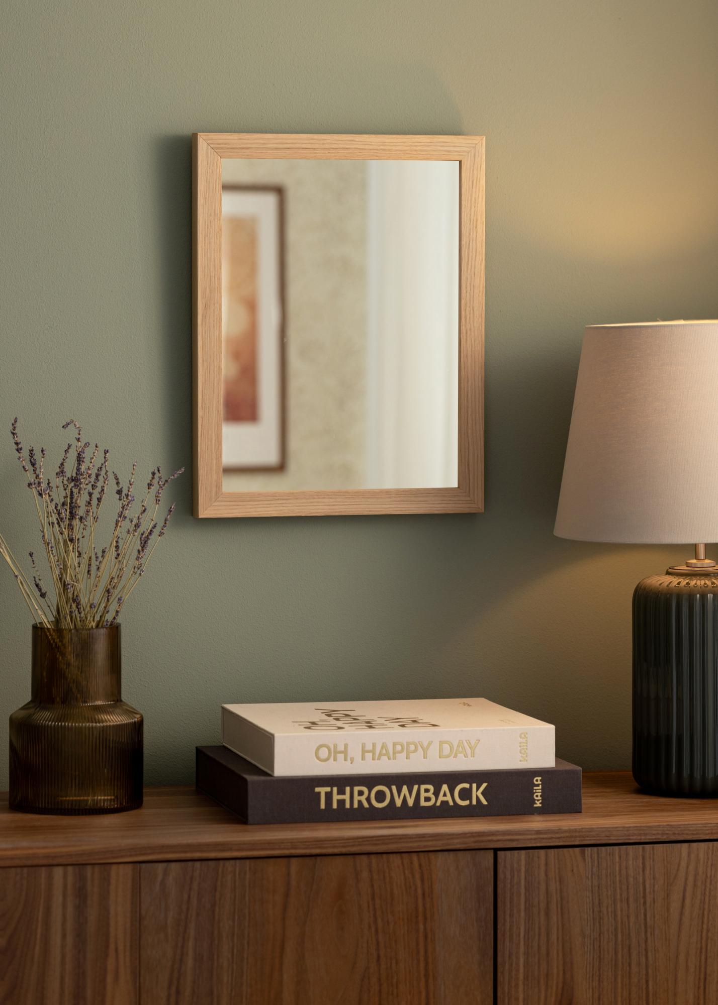 Η κορνίζα είναι κατασκευασμένη από πεύκο, το οποίο την καθιστά ανθεκτική και ελαφριά. Το βάθος των 32 mm δίνει στον καθρέφτη μια σταθερή κατασκευή και εξασφαλίζει ότι τοποθετείται με ασφάλεια στον τοίχο. Η ζεστή απόχρωση στο μοτίβο δρυός αναδεικνύει τον διαχρονικό σχεδιασμό του καθρέφτη και το καθιστά εύκολο να συνδυαστεί με διάφορα στυλ διακόσμησης.