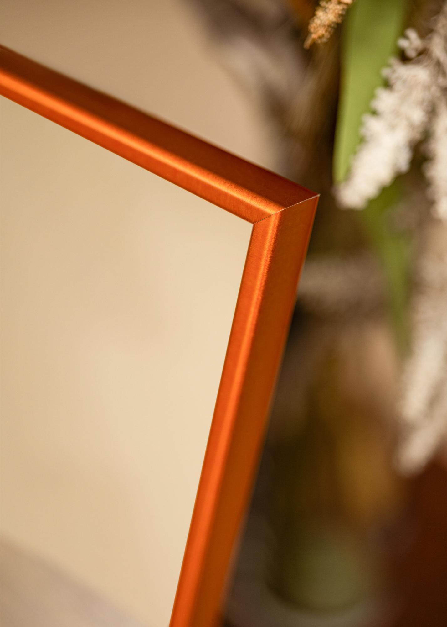 Κομψός και κομψός καθρέφτης με ένα όμορφο πλαίσιο κεχριμπαρένιου χρώματος με ματ επιφάνεια.
