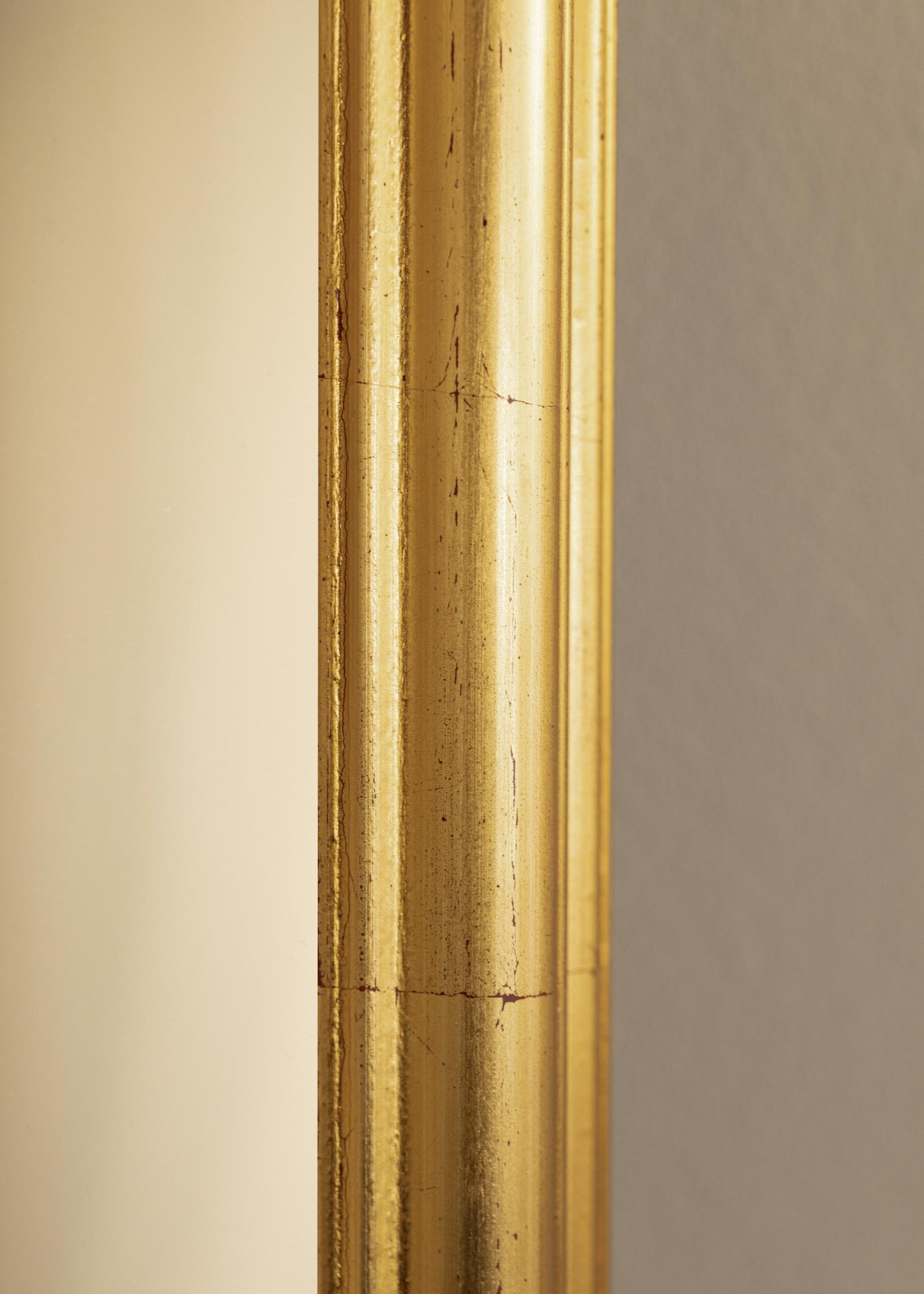 Το πλαίσιο είναι κατασκευασμένο από ξύλο ayos και έχει ένα απαλά καμπύλο προφίλ που συμβάλλει στη σοφιστικέ εμφάνιση του καθρέφτη. Η επιφάνεια είναι πατιναρισμένη με αντίκες με λεπτές ρωγμές και μικρές σκοτεινές λεπτομέρειες, προσδίδοντας στον καθρέφτη μια αυθεντική vintage αίσθηση. Η χρυσή του επίστρωση δημιουργεί μια ζεστή και κλασική ατμόσφαιρα, ιδανική για να προσθέσετε στο σπίτι σας μια πινελιά διαχρονικής κομψότητας.