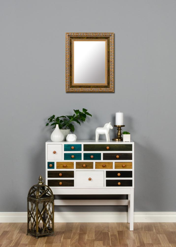 Με τη βοήθεια του σωστού καθρέφτη, μπορείτε να αναδείξετε έναν ολόκληρο τοίχο! Αυτός ο πολυτελής χρυσός καθρέφτης έχει έναν συναρπαστικό σχεδιασμό που προσελκύει την προσοχή. Η ξύλινη κορνίζα μπροστά διαθέτει τόσο μια μεγάλη όσο και μια μικρότερη ταινία με κυριλλικά μοτίβα που διακόπτεται από ένα φθαρμένο τμήμα. Η επιφάνεια είναι επεξεργασμένη για να φαίνεται χαρακτηριστικά παλαιωμένη. Επειδή κατασκευάζεται σύμφωνα με τις διαστάσεις σας, μπορείτε να είστε βέβαιοι ότι θα ταιριάζει ακριβώς εκεί που τη θέλετε!