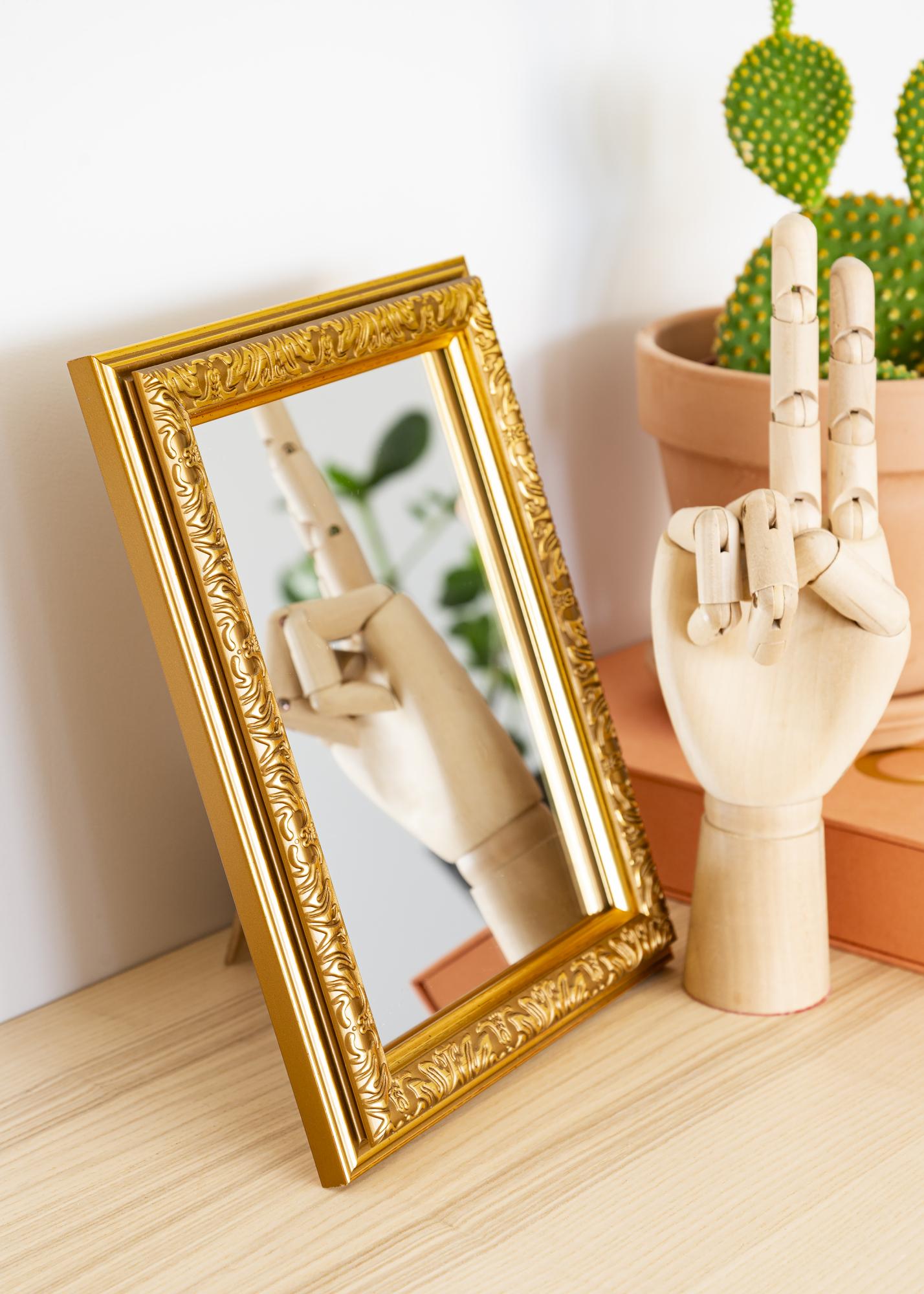 Ξεκινήστε τον επιλογέα κορνίζας »Η σειρά Nost Gold περιλαμβάνει καθρέφτες τοίχου. Το πλαίσιο είναι πλούσια διακοσμημένο με ακανόνιστα σύμβολα που δίνουν μια ελαφρώς μυστηριώδη εντύπωση.