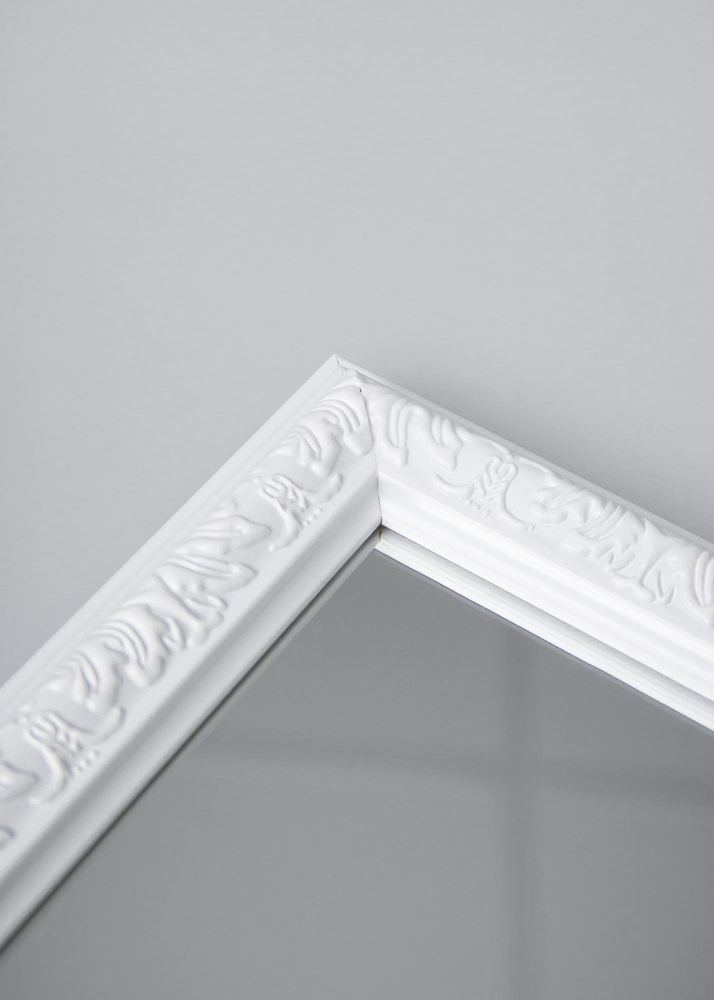 Αυτός ο καθρέφτης τοίχου είναι μια κομψή λεπτομέρεια εσωτερικού χώρου που αντανακλά όμορφα το φως από όλες τις πηγές φωτός του δωματίου. Η λευκή κορνίζα δίνει μια φωτεινή και φρέσκια εντύπωση, που συμπληρώνεται τέλεια από το διακοσμητικό προφίλ και τα όμορφα μοτίβα του πλαισίου.