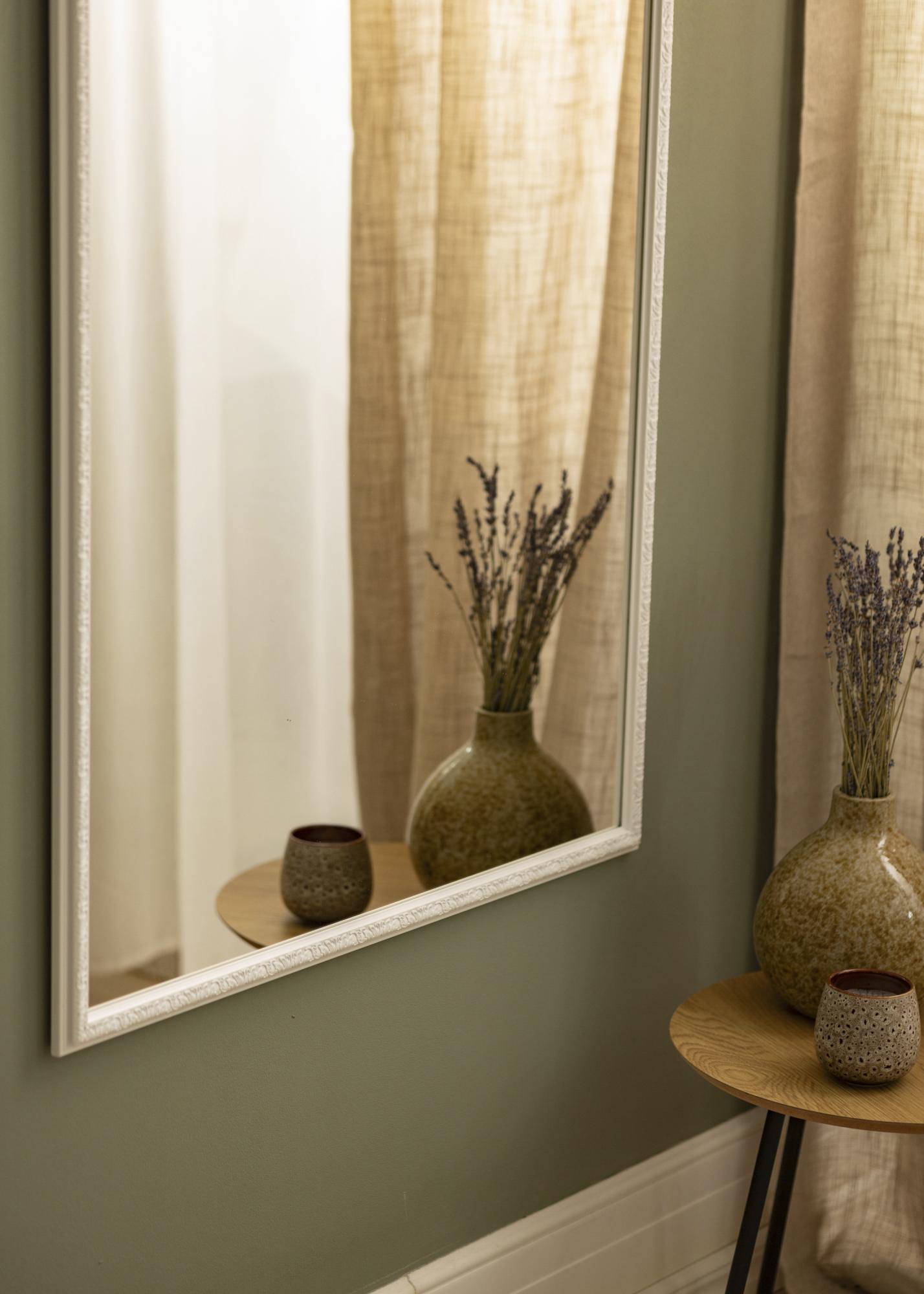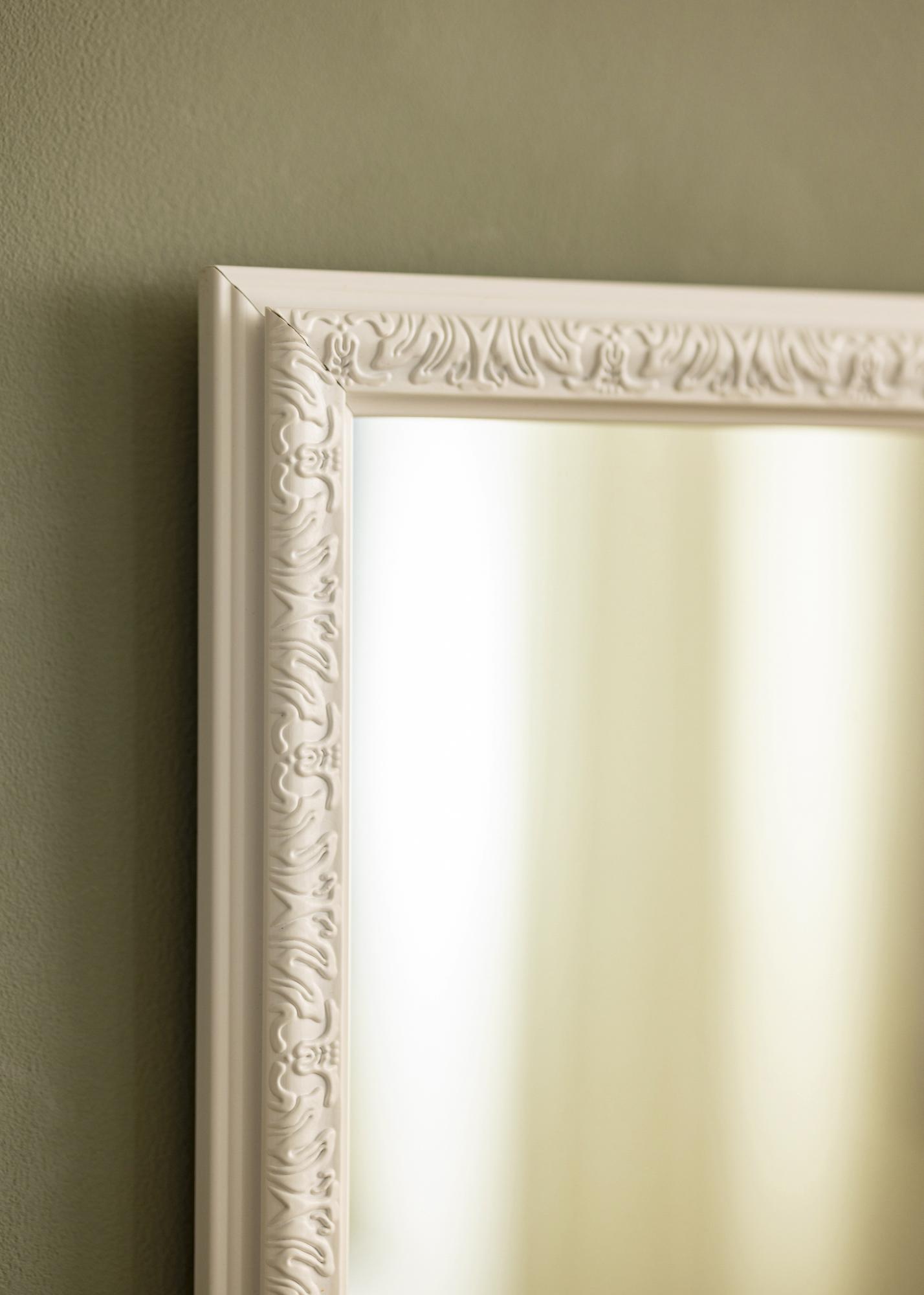 Αυτός ο επιτοίχιος καθρέφτης είναι μια κομψή λεπτομέρεια διακόσμησης που αντανακλά όμορφα το φως από όλες τις πηγές φωτός του δωματίου. Η λευκή κορνίζα δίνει μια φωτεινή και φρέσκια εντύπωση, που συμπληρώνεται τέλεια από το διακοσμητικό προφίλ και τα όμορφα σχέδια της κορνίζας.