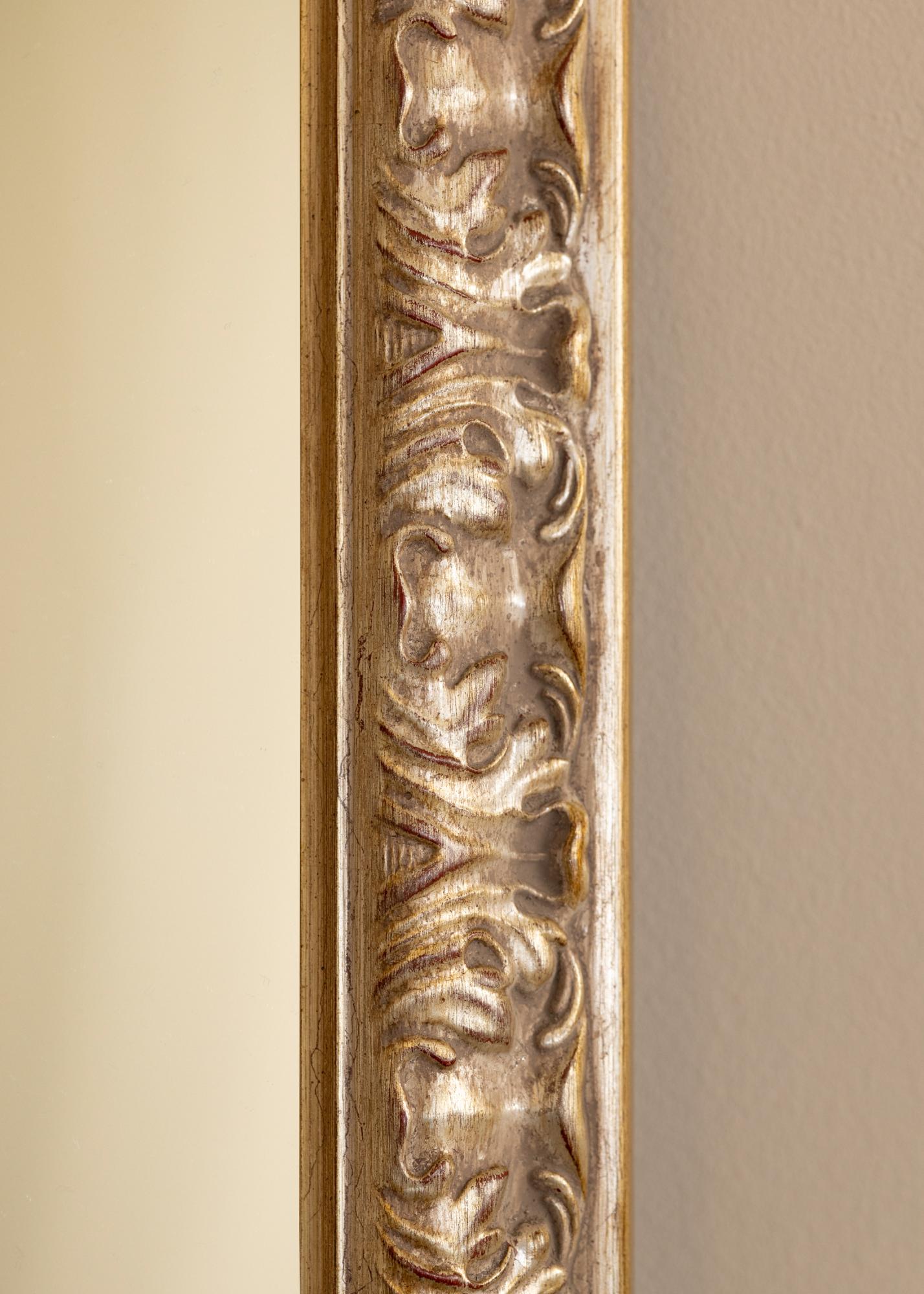 Η κορνίζα είναι κατασκευασμένη από πεύκο και έχει φινίρισμα με αντίκα αργύρου με διακριτικές χρυσές λεπτομέρειες και κόκκινες αποχρώσεις. Αυτός ο χρωματικός συνδυασμός δημιουργεί μια όμορφη αντίθεση και δίνει στον καθρέφτη μια κλασική και σοφιστικέ έκφραση. Η διακοσμητική του εμφάνιση κάνει τον καθρέφτη να ταιριάζει ιδανικά για κορνιζώματα όπου επιδιώκεται μια κομψή αίσθηση.