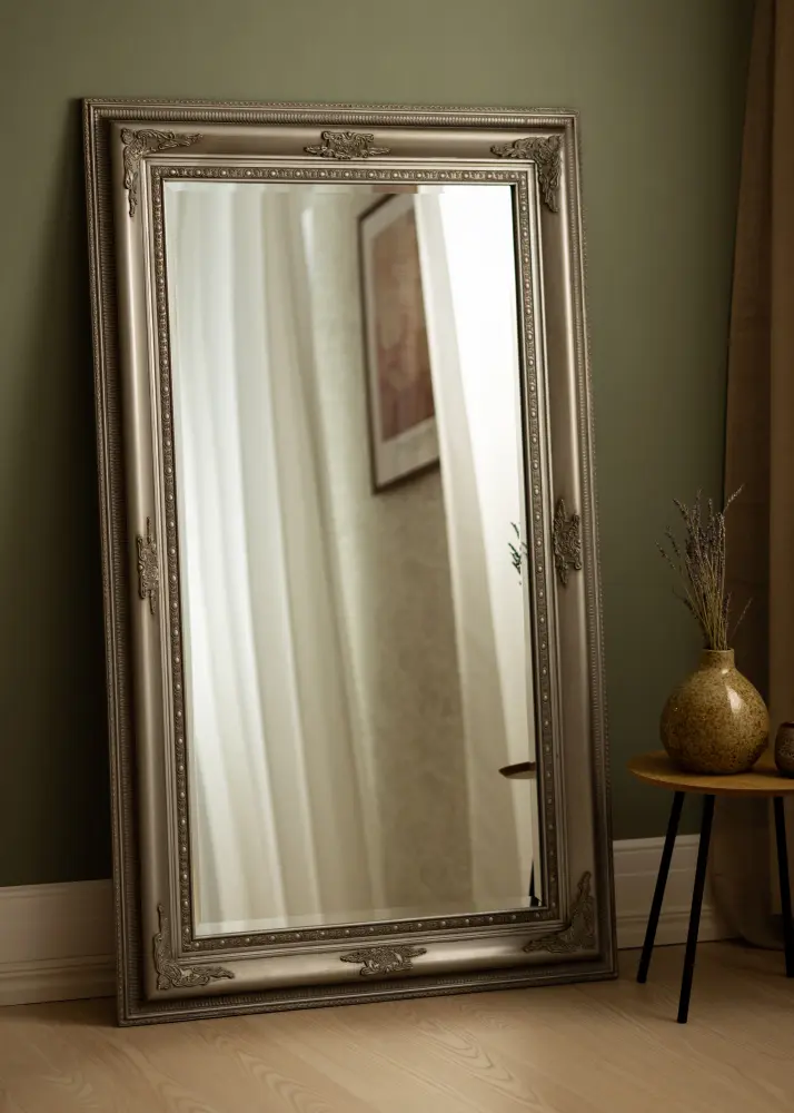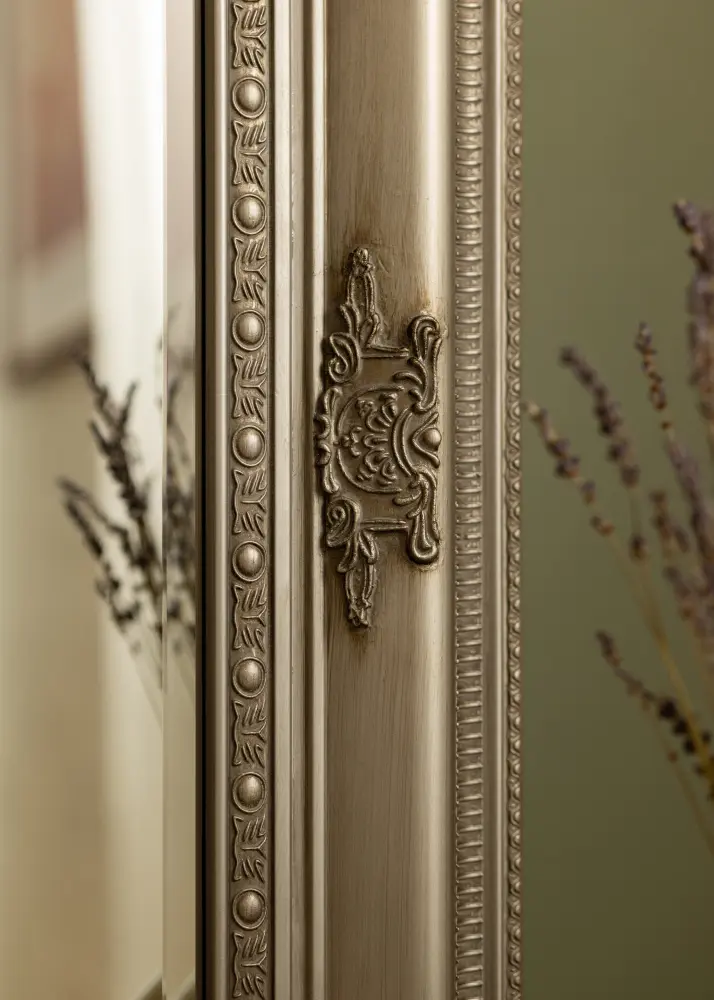 Ασημί καθρέφτης σε κλασικό στυλ με μοτίβο προφίλ και κοσμήματα από λουλούδια γύρω γύρω. Η αρχαιότροπη αίσθηση του καθρέφτη τον καθιστά ιδανικό για μια διακόσμηση με έπιπλα στυλ, αλλά αποτελεί επίσης μια συναρπαστική αντίθεση σε έναν στιλάτο σύγχρονο εσωτερικό χώρο. Η μορφή του κάνει τον καθρέφτη κατάλληλο τόσο για το χολ, όσο και για τη μεγάλη γκαρνταρόμπα ή σε έναν τοίχο στο υπνοδωμάτιο όπου τα ρούχα παίζουν σημαντικό ρόλο στη διακόσμηση. Αναδείξτε τον καθρέφτη με διακοσμητικά αξεσουάρ σε ασημί στο δωμάτιο.