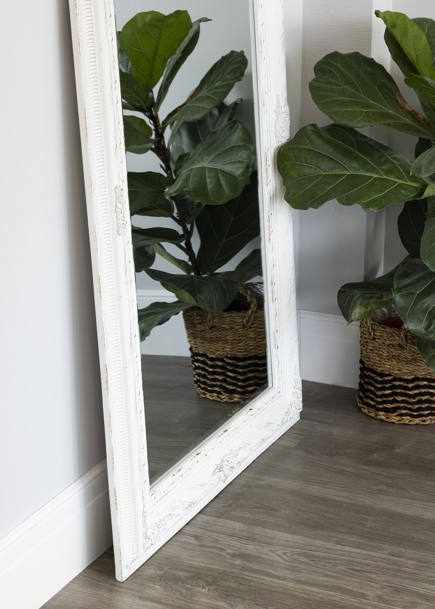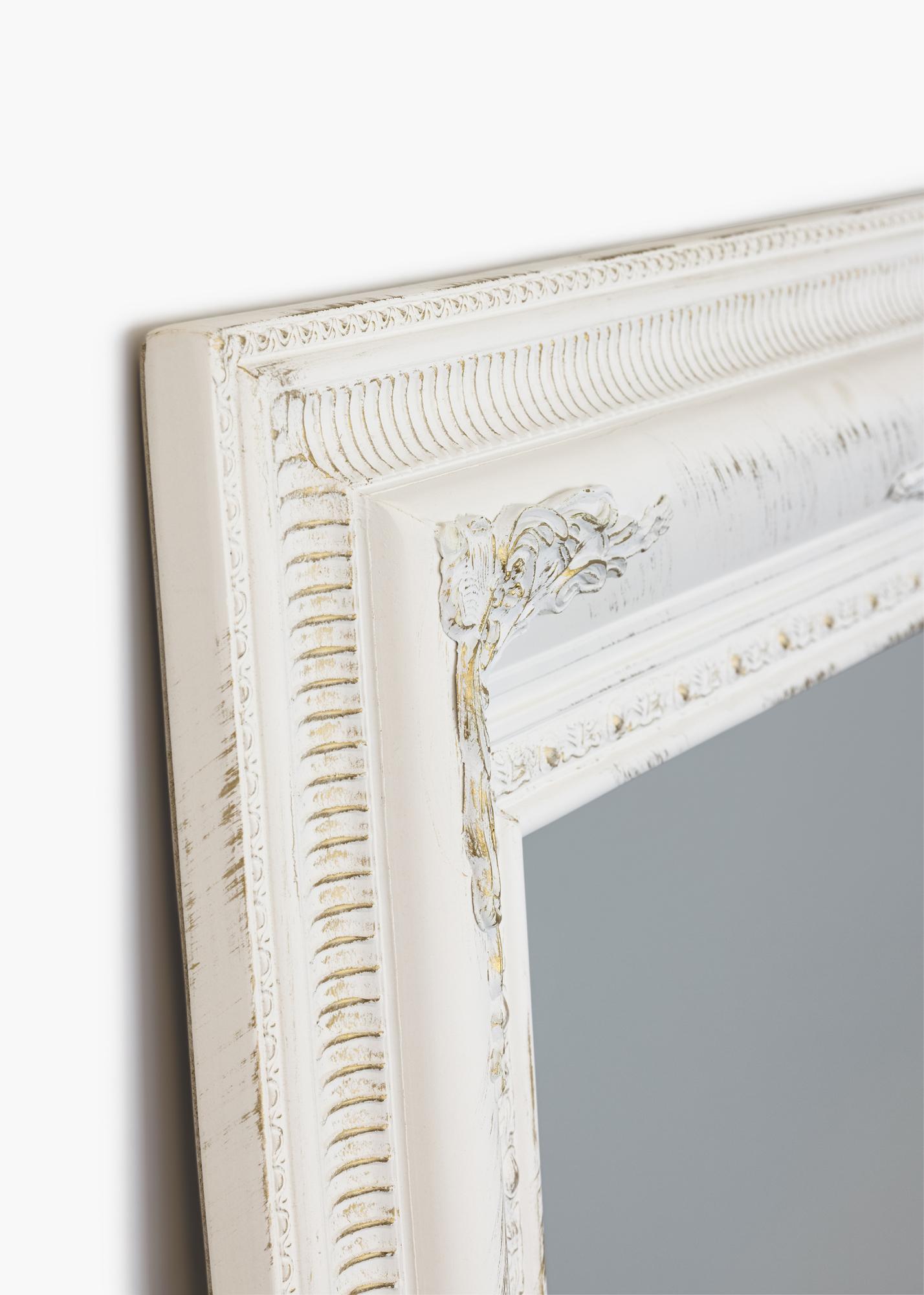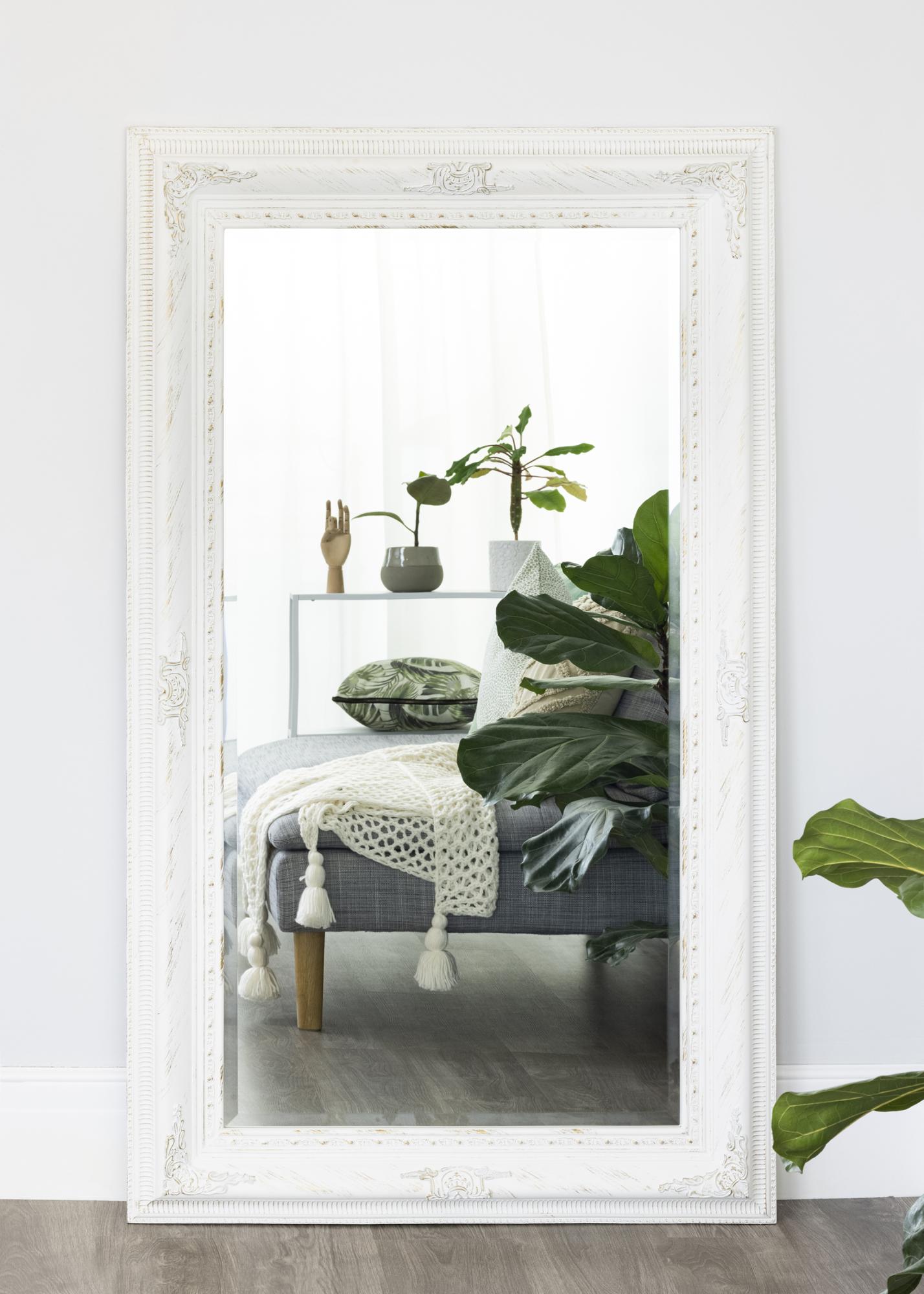 Καθρέπτης σε λευκό με ρομαντική αίσθηση, ιδανικός για όσους θέλουν να δημιουργήσουν μια διακόσμηση που αποπνέει ρόδα, γοητεία και παρελθόντες εποχές. Ο καθρέπτης είναι όμορφος να κρεμαστεί τόσο στο μπάνιο πάνω από ένα μεγαλύτερο έπιπλο όσο και στο υπόλοιπο σπίτι, το μέγεθος του τον καθιστά κατάλληλο να τοποθετηθεί στον τοίχο πάνω από ένα γερό ντουλάπι ή τον καναπέ. Ο καθρέπτης μπορεί επίσης να χρησιμοποιηθεί ως μέρος ενός τοίχου με πίνακες που έχουν κορνίζες με λευκά πλαίσια παρόμοιου στυλ και βοηθά στο να φωτίσει ένα σκοτεινό δωμάτιο αν κρεμαστεί απέναντι από ένα παράθυρο.