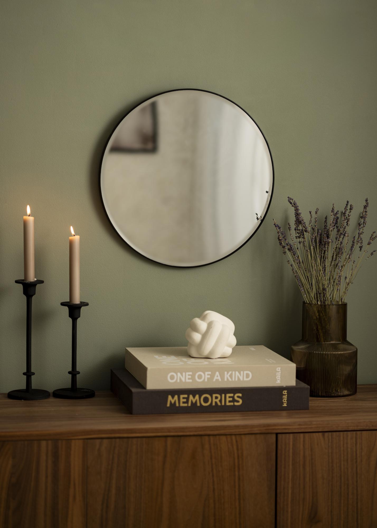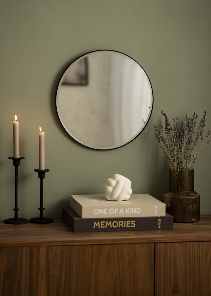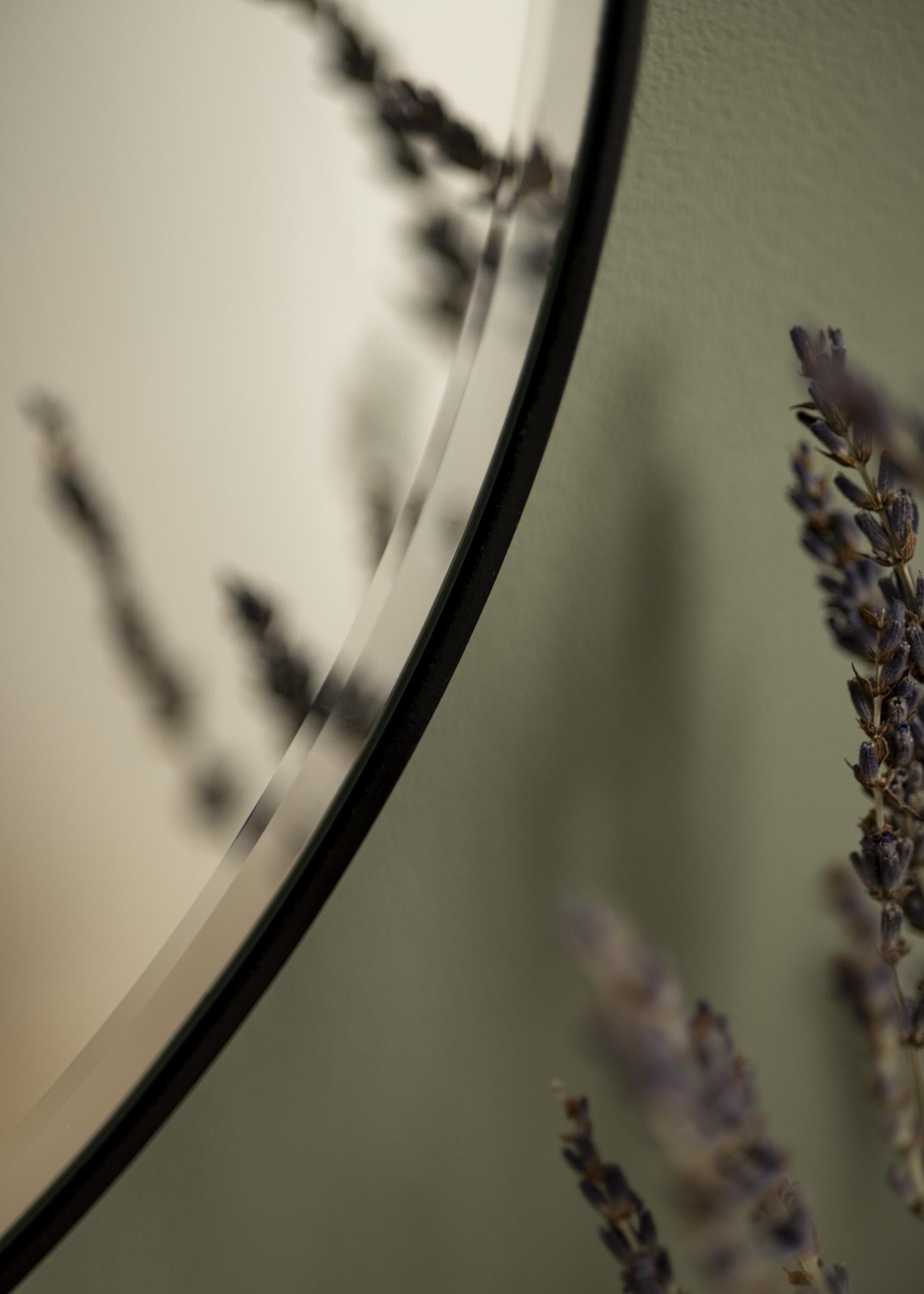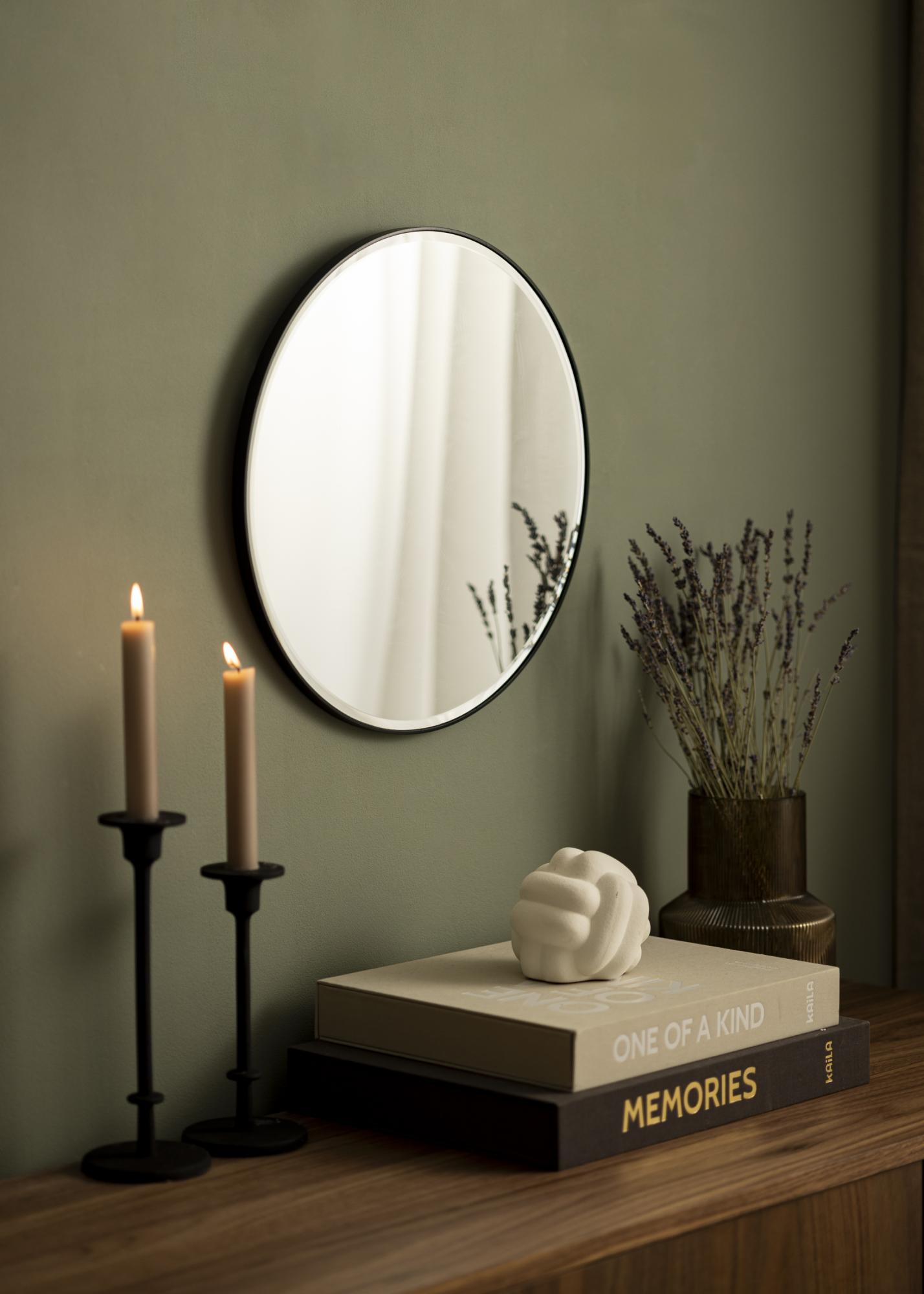 Αυτός ο στρογγυλός καθρέφτης προέρχεται από τη δανέζικη Incado και έχει μοντέρνο σχεδιασμό με αίσθηση πολυτέλειας. Αυτό οφείλεται στον επιτυχημένο συνδυασμό του μοντέρνου μαύρου πλαισίου και της κομψής λοξοτομημένης άκρης του καθρέφτη. Αυτός ο κομψός σχεδιασμός επιτρέπει σε αυτόν τον καθρέφτη να ταιριάζει στα περισσότερα σπίτια και στυλ εσωτερικής διακόσμησης.