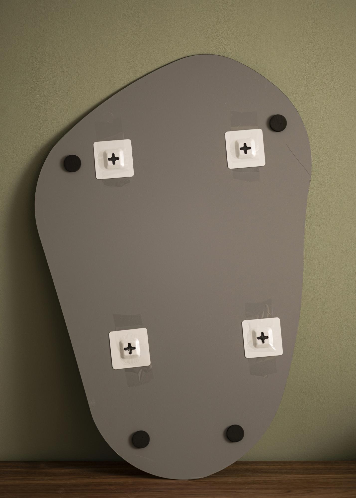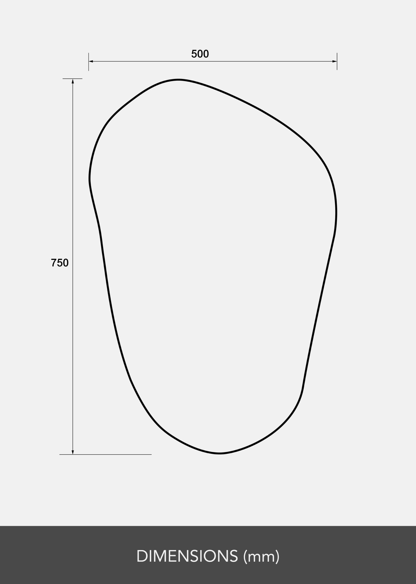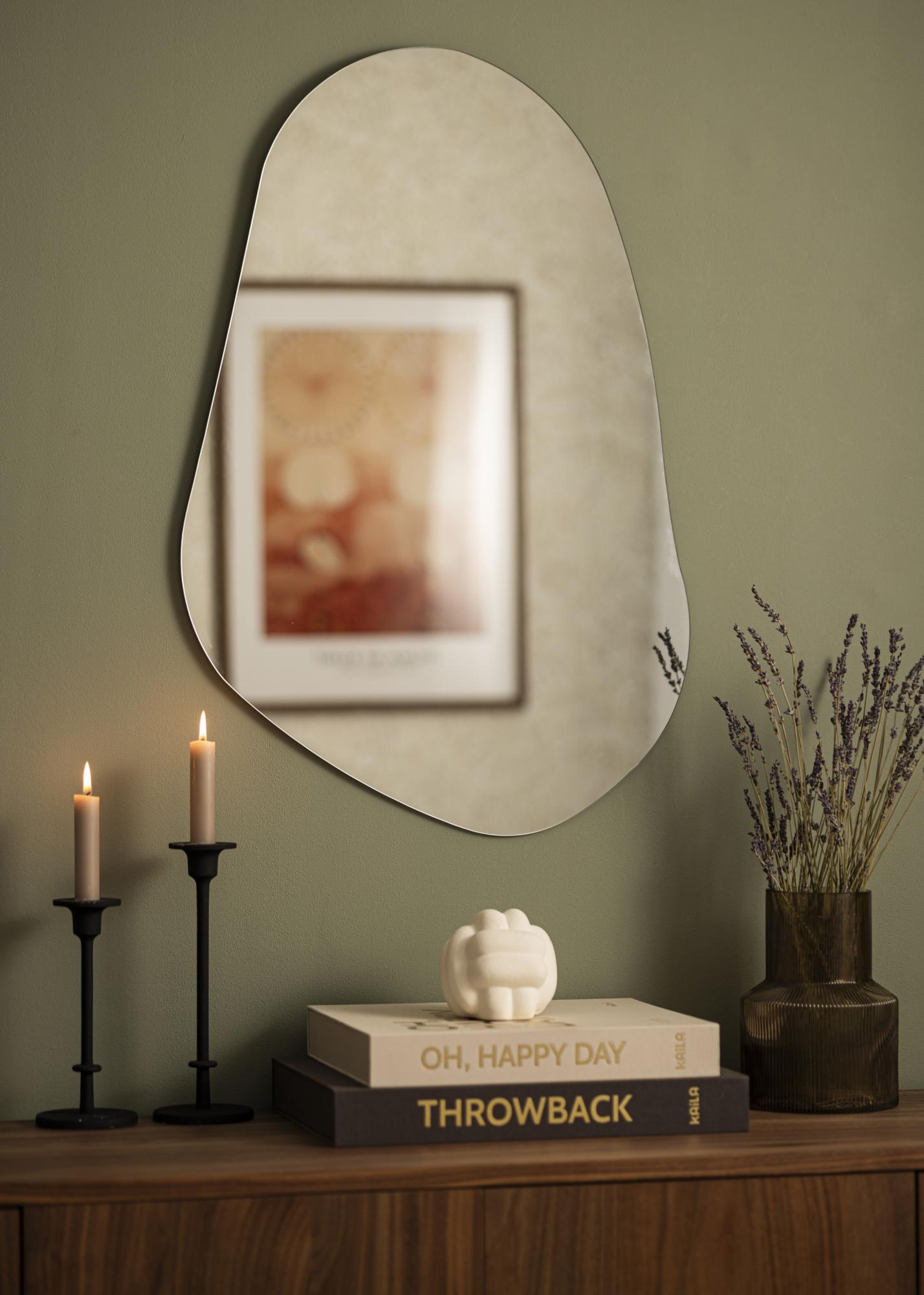 Αυτός ο Καθρέφτης έχει μια οργανική, ασύμμετρη και απαλά κυματιστή μορφή που προσδίδει μια μοντέρνα και καλλιτεχνική αίσθηση. Με τις στρογγυλεμένες καμπύλες του και την απουσία ευθειών ακμών, θυμίζει ένα ελεύθερα σχεδιασμένο περίγραμμα, όπως μια φυσικά διαμορφωμένη πέτρα ή μια επιμηκυμένη σταγόνα.