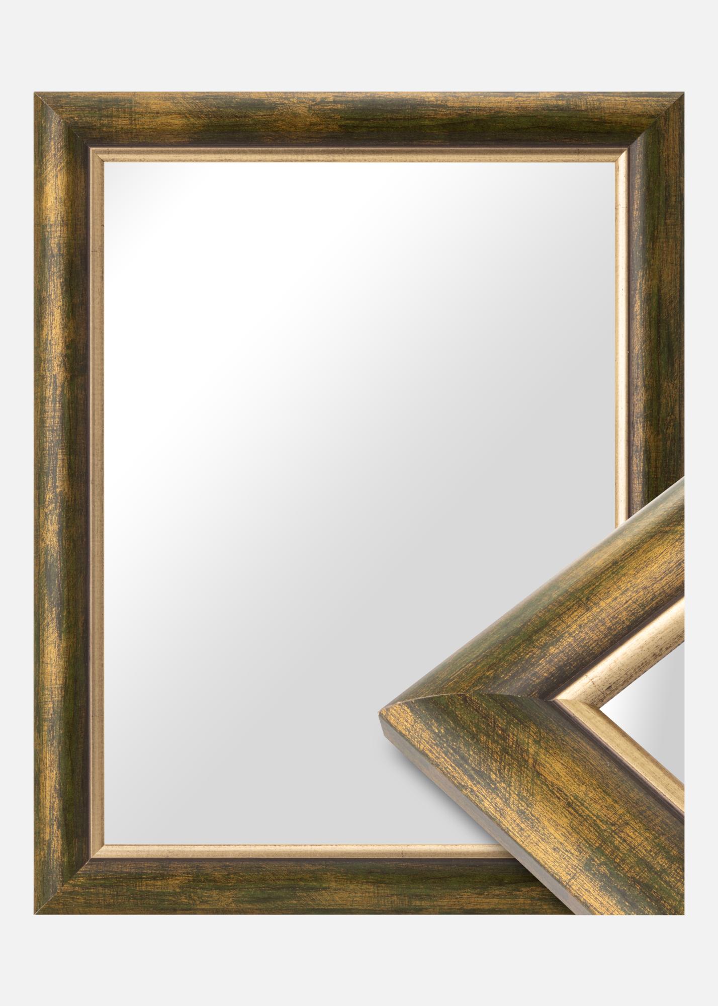 Διαχρονική ξύλινη κορνίζα κατασκευασμένη στη Φινλανδία με κομψή ξύλινη επιφάνεια πρασινωπής απόχρωσης με χρυσή άκρη κοντά στον καθρέφτη. Η κορνίζα έχει ευρεία προφίλ 41 χιλιοστών και βάθος 19 χιλιοστών, προσδίδοντας επιπλέον βάθος στον καθρέφτη σας.