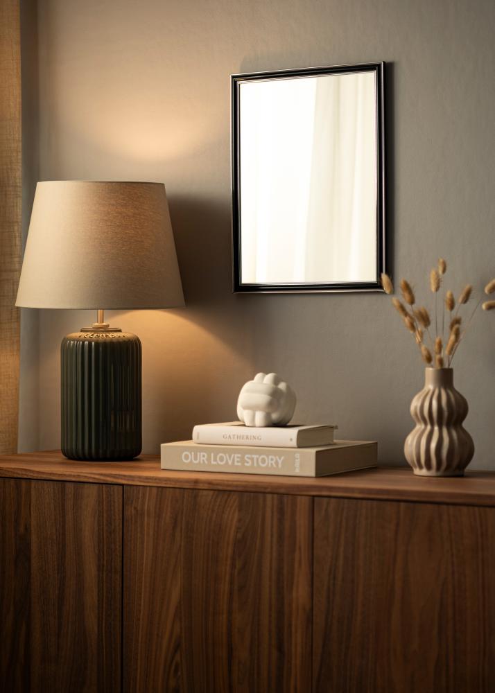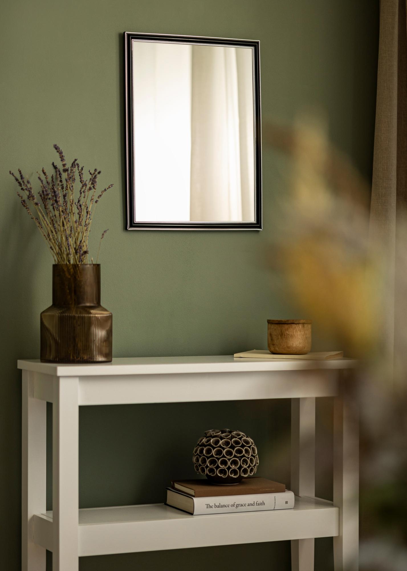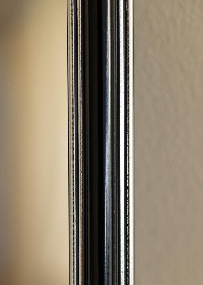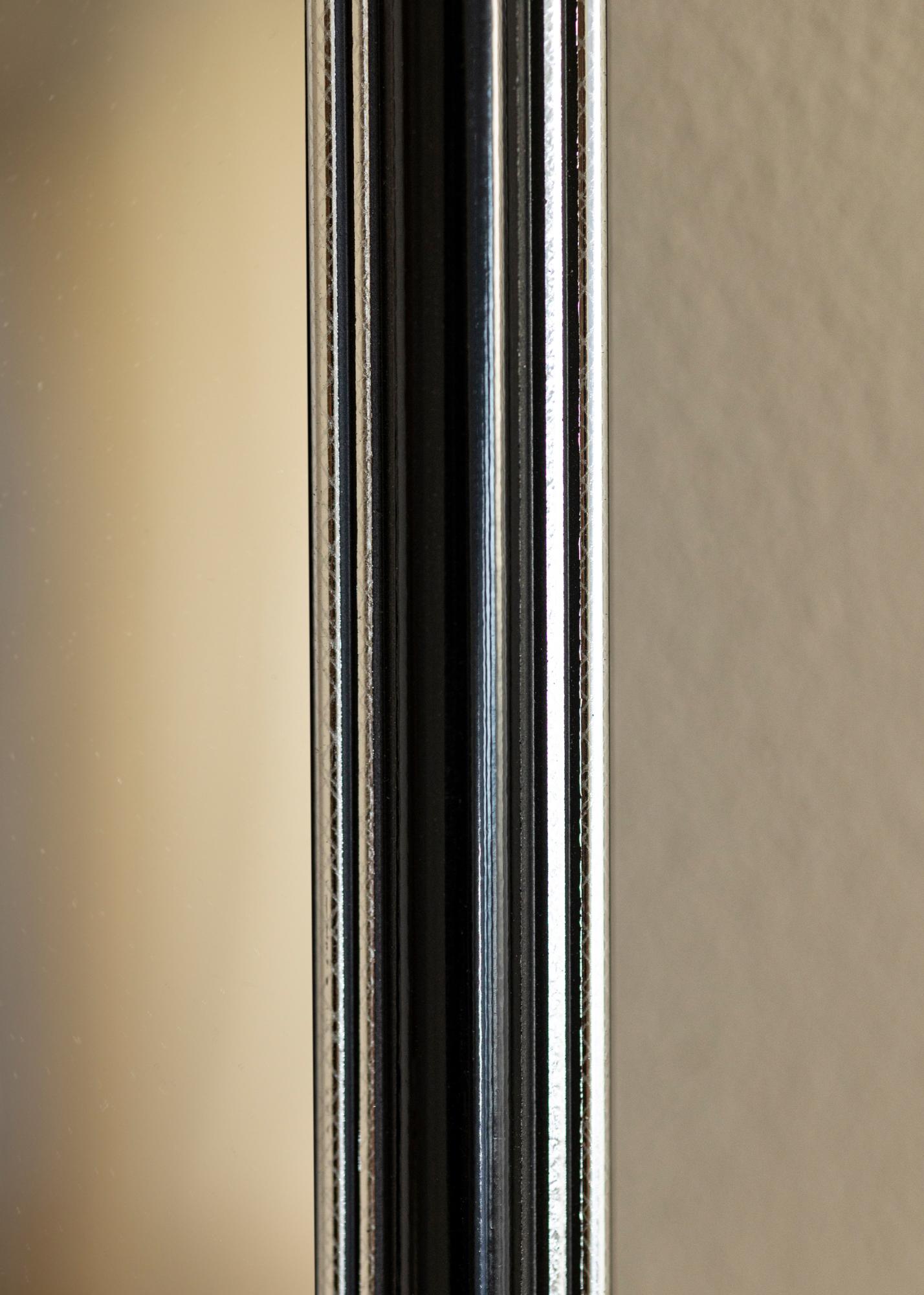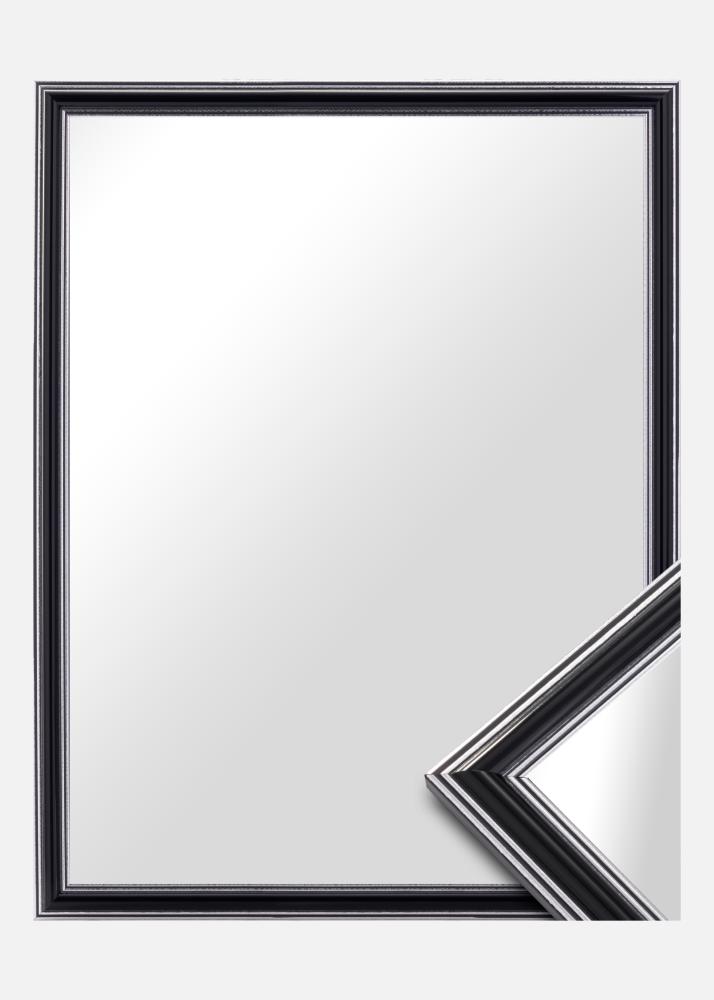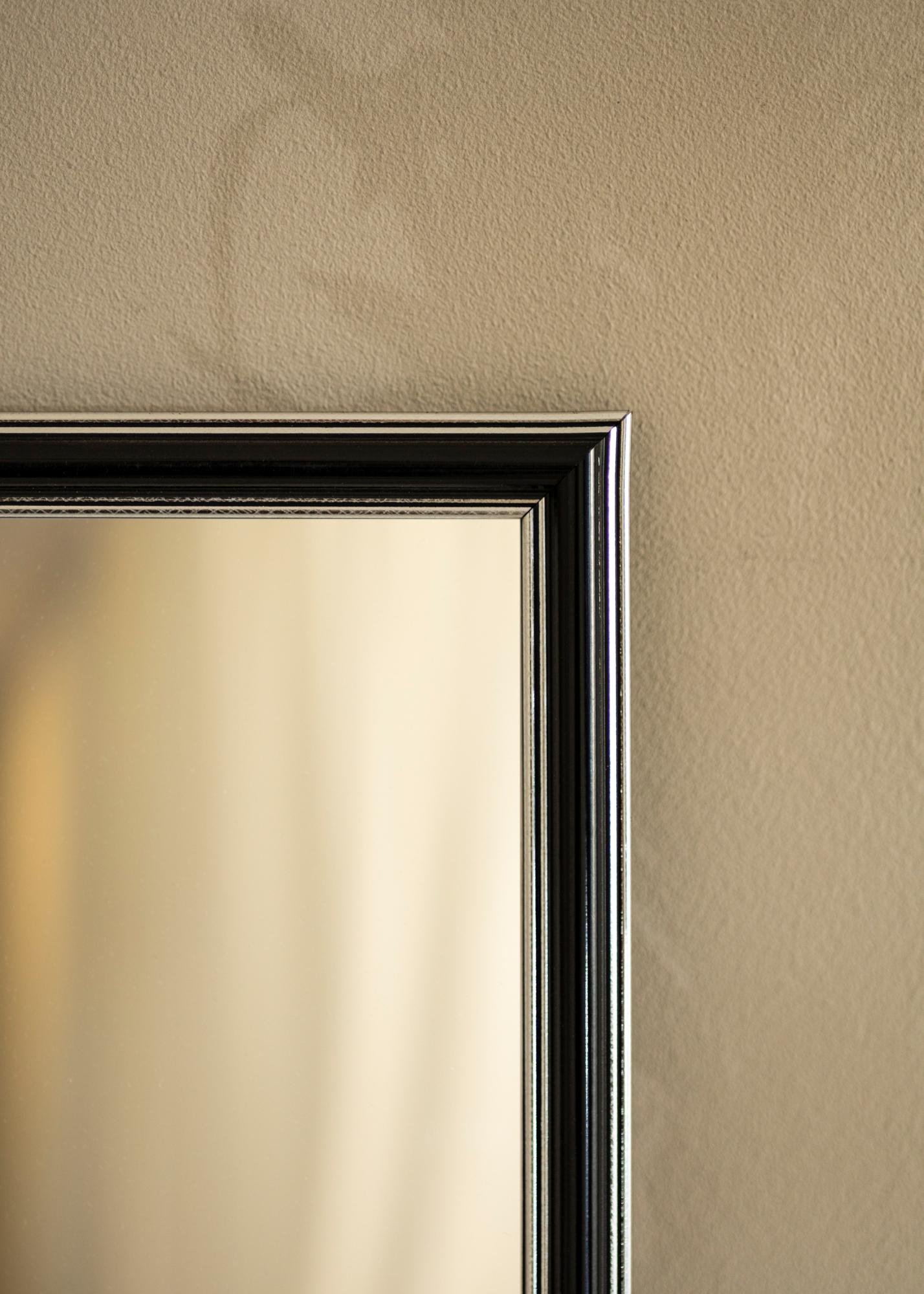 Αποκτήστε έναν κομψό καθρέφτη που σίγουρα ταιριάζει εκεί που τον θέλετε! Αυτός ο πολυτελής καθρέφτης κατασκευάζεται σύμφωνα με τις διαστάσεις σας στο δικό μας εργαστήριο κατασκευής κορνιζών. Το μαύρο κέντρο με ασημί άκρα προς το εξωτερικό και κοντά στο γυαλί προσθέτει μια αρρενωπή πινελιά. Ταιριάζει εύκολα με άλλα διακοσμητικά είδη σε αποχρώσεις όπως το ασημί, το μαύρο, το λευκό και το μωβ.
