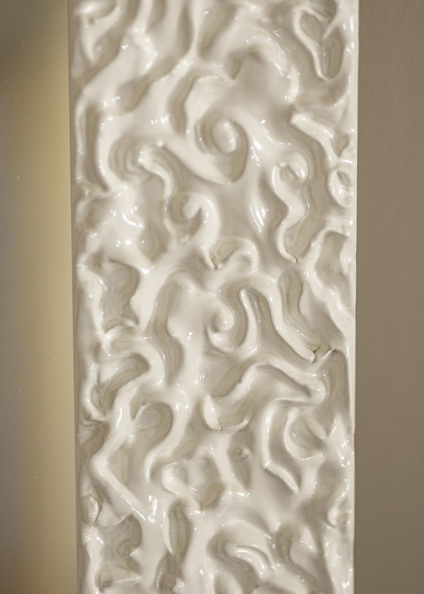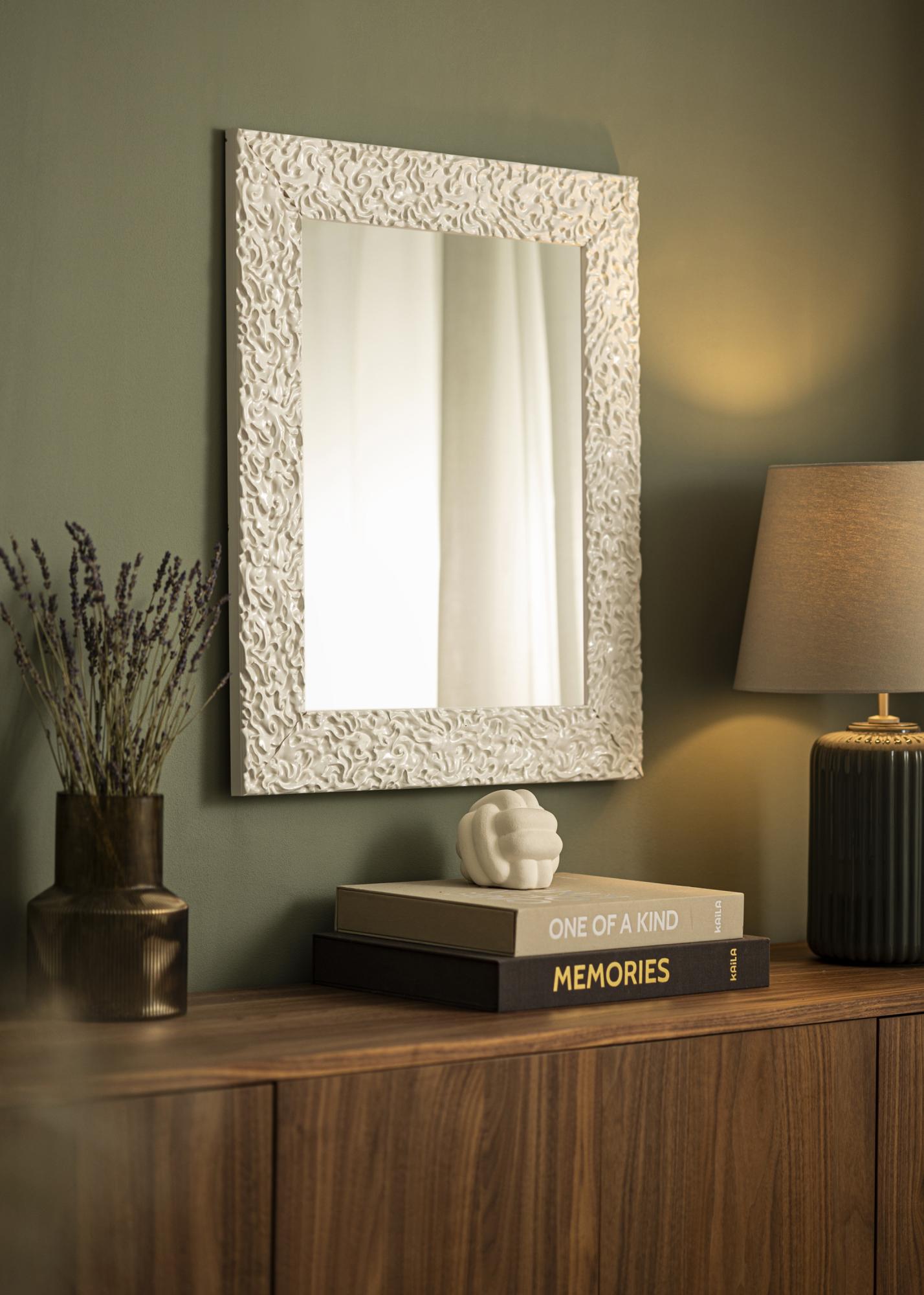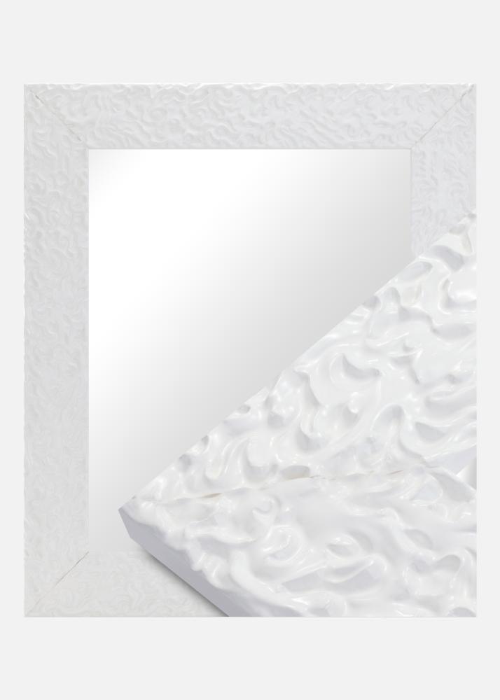 Η υπερ-λαμπρή λευκή επιφάνεια του καθρέφτη έχει ένα ζωντανό, οργανικό μοτίβο που δημιουργεί μια σύγχρονη και κομψή αίσθηση. Η γυαλιστερή αυτή επιφάνεια ενισχύει τις απαλές, ρέουσες γραμμές και δίνει στο πλαίσιο μια αποκλειστική έκφραση. Είναι η τέλεια λύση για εσάς που αναζητάτε ένα εντυπωσιακό στοιχείο που συνδυάζει κλασική έμπνευση με σύγχρονο σχεδιασμό.