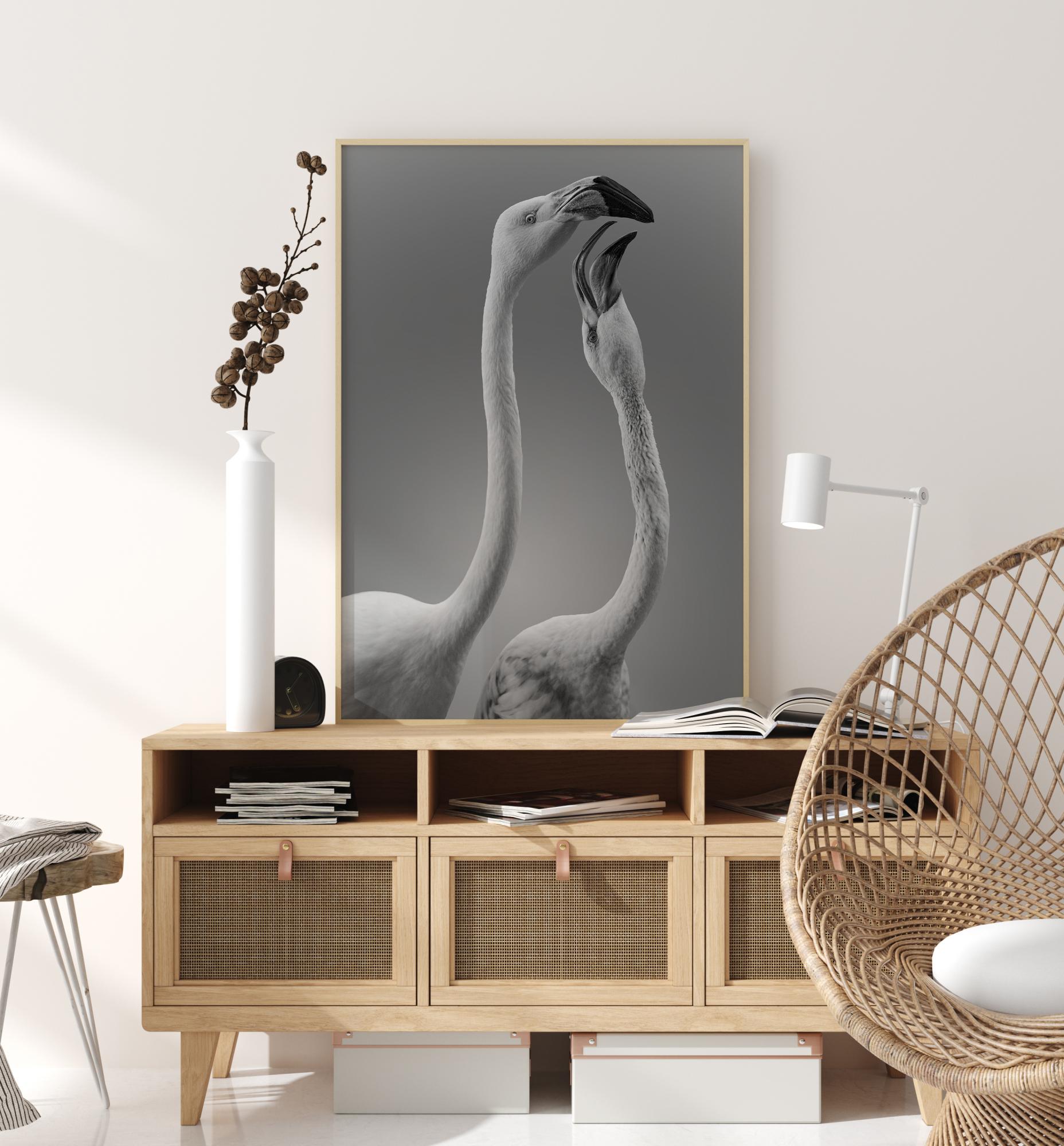Μια αφίσα φύσης με δύο φλαμίνγκο που σκύβουν προς τα εμπρός για να φιλήσουν το ένα το άλλο. Οι απαλές γκρι αποχρώσεις σε αυτή την ασπρόμαυρη φωτογραφία θα εξισορροπήσουν όμορφα με παστέλ χρώματα. Νιώστε ηρεμία με αυτά τα δύο πουλιά.