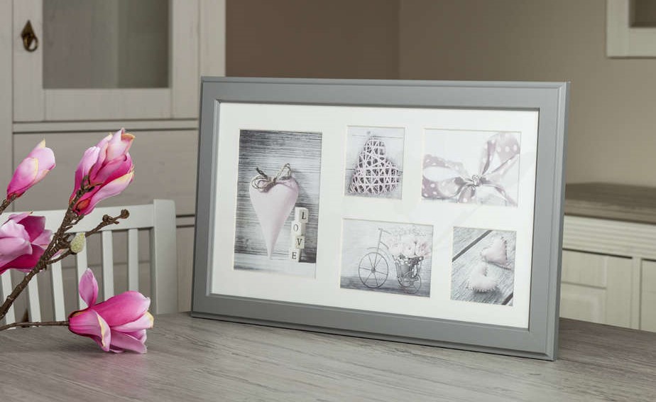Το σπίτι γίνεται πολύ πιο προσωπικό με τις αγαπημένες σας φωτογραφίες στους τοίχους. Εδώ έχουμε μια πολυτελή κορνίζα κολάζ που είναι σε ανοιχτό γκρι με λευκό passepartout. Επειδή είναι προσαρμοσμένη για φωτογραφίες σε διαφορετικά μεγέθη, προσφέρει μια επιπλέον ζωντανή εντύπωση. Γεμίστε την με εικόνες που ακολουθούν το ίδιο θέμα για μια όμορφη συνολική εμφάνιση.