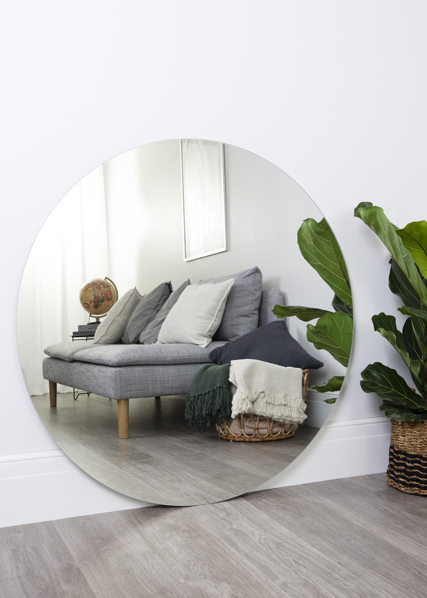 Ξεκινήστε τον επιλογέα κορνίζας »110 cm Ø στρογγυλός καθρέφτης που περιλαμβάνεται σε μια σειρά με στρογγυλούς καθρέφτες. Ο καθρέφτης είναι εξαιρετικά λεπτός και κομψός και ταιριάζει σε κάθε είδους δωμάτιο και στιλ διακόσμησης.