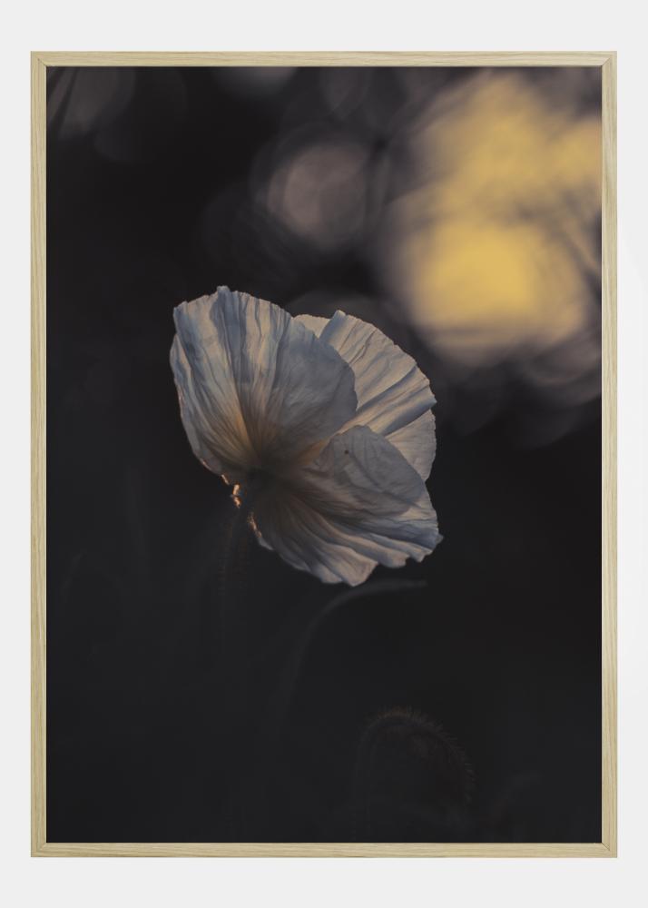 Αυτή η αφίσα αιχμαλωτίζει την ουσία ενός ήρεμου σούρουπου με μια μοναχική παπαρούνα στο προσκήνιο που φωτίζεται από τις τελευταίες ακτίνες ενός ηλιοβασιλέματος. Το λουλούδι είναι λεπτό και λεπτομερές, τα πέταλά του έχουν μια φωτεινή, σχεδόν διαφανή απόχρωση λευκού και απαλού μπλε που έρχεται σε αντίθεση με το ζεστό, θολό φόντο του ηλιοβασιλέματος σε αποχρώσεις του πορτοκαλί και καφέ.