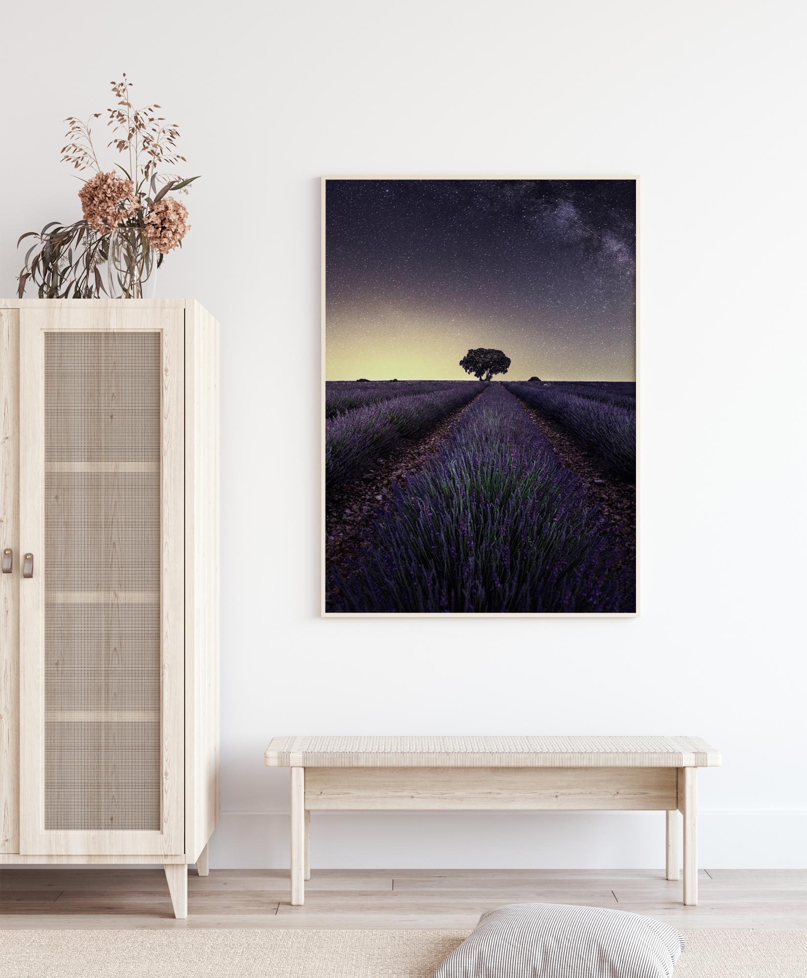 Μια πραγματικά μαγευτική αφίσα ενός πεδίου λεβάντας. Οι έντονες αποχρώσεις της μωβ λεβάντας που είναι τέλεια προσαρμοσμένες μεταξύ τους χορεύουν στο πρωινό αεράκι. Ένα μοναχικό δέντρο φωτίζεται από τον πρωινό ήλιο και συμπληρώνεται από τον σκοτεινό νυχτερινό ουρανό. Κρεμάστε αυτή την εκτύπωση στην κουζίνα σας για μια φυσική ατμόσφαιρα.