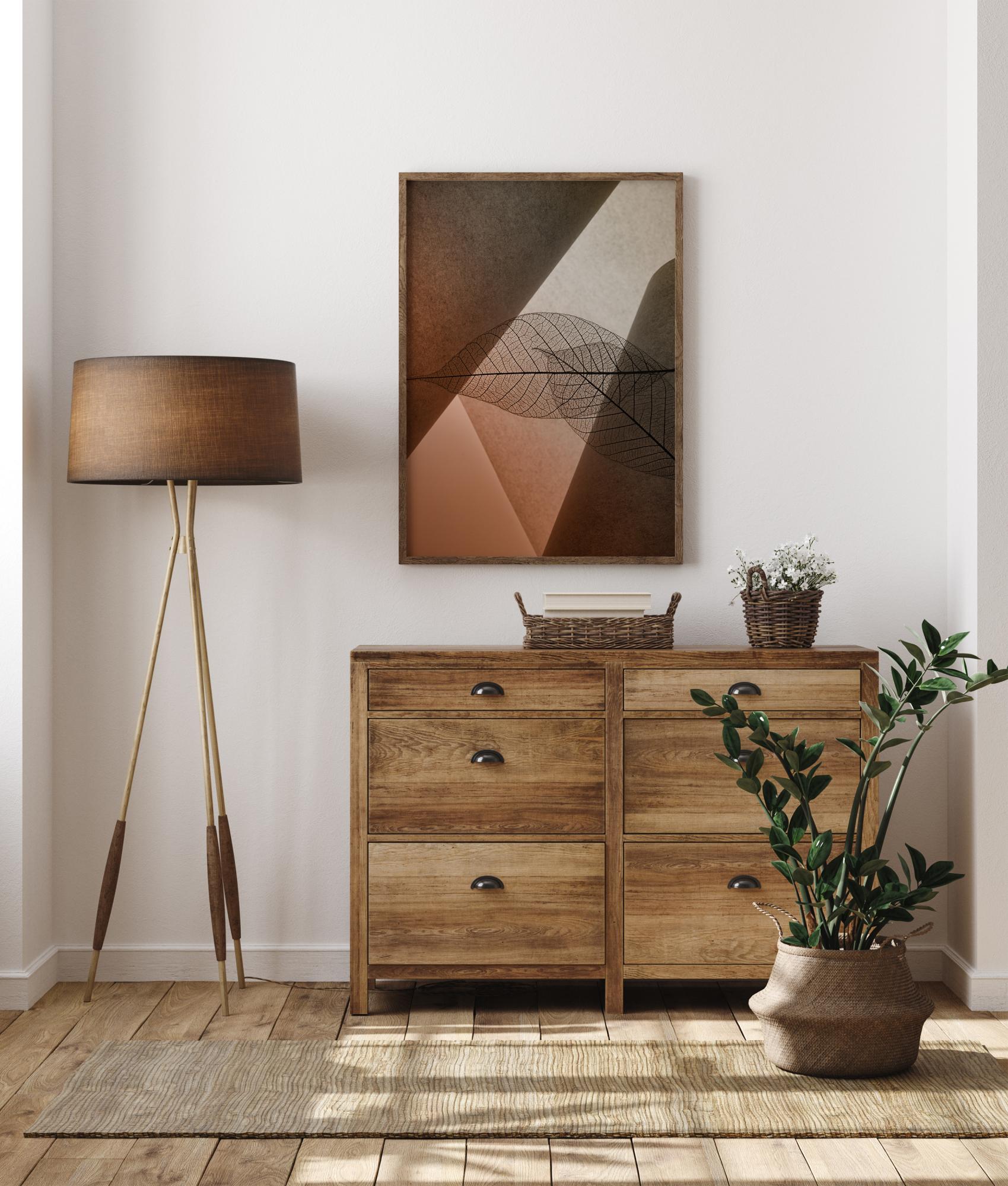 Μια εκπληκτική εικόνα δύο φύλλων που προβάλλονται απέναντι στο ηλιακό φως. Η ακτίνα φωτός ενισχύει τις φλέβες των φύλλων. Η όμορφη εικόνα κυριαρχείται από διάφορες καφέ αποχρώσεις, ενώ το φόντο χαρακτηρίζεται από τόσο τραχιά όσο και λεια μέρη που αντανακλούν το φως. Μια τέλεια αφίσα για να δώσει φως σε ένα δωμάτιο.