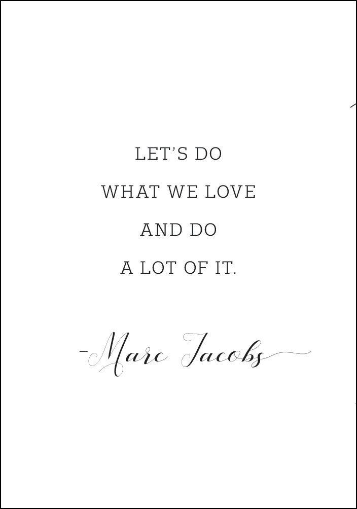 Αυτή η αφίσα με κίνητρα αναπαράγει τη γνωστή φράση του Marc Jacobs στα αγγλικά: "Let's do what we love to do and do a lot of it" - "Ας κάνουμε αυτό που αγαπάμε να κάνουμε και να το κάνουμε πολύ". Το μαύρο κείμενο που ξεχωρίζει σε ένα λευκό φόντο μεταφέρει ένα άμεσο μήνυμα. Ιδανική για έναν λευκό τοίχο υπνοδωματίου.