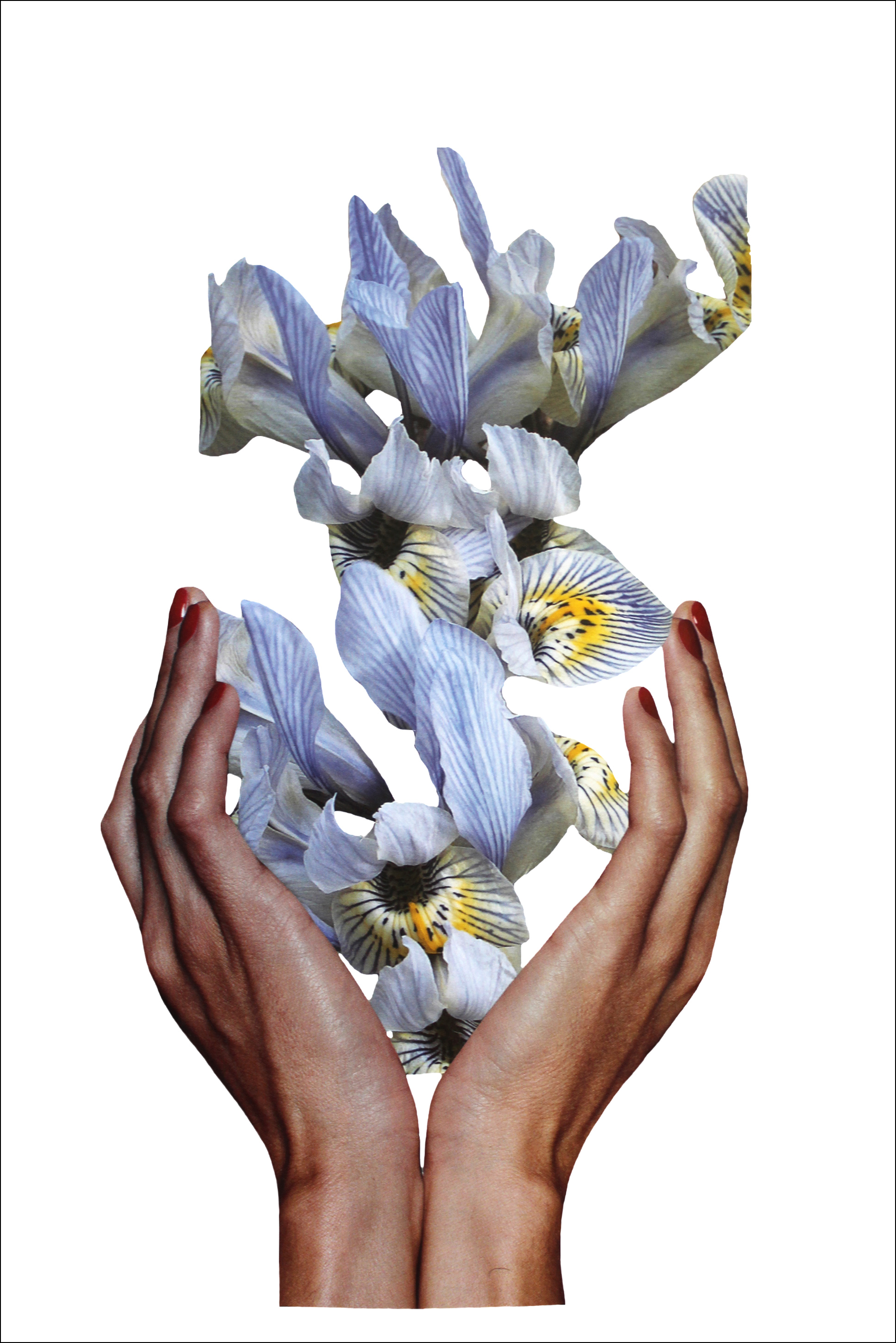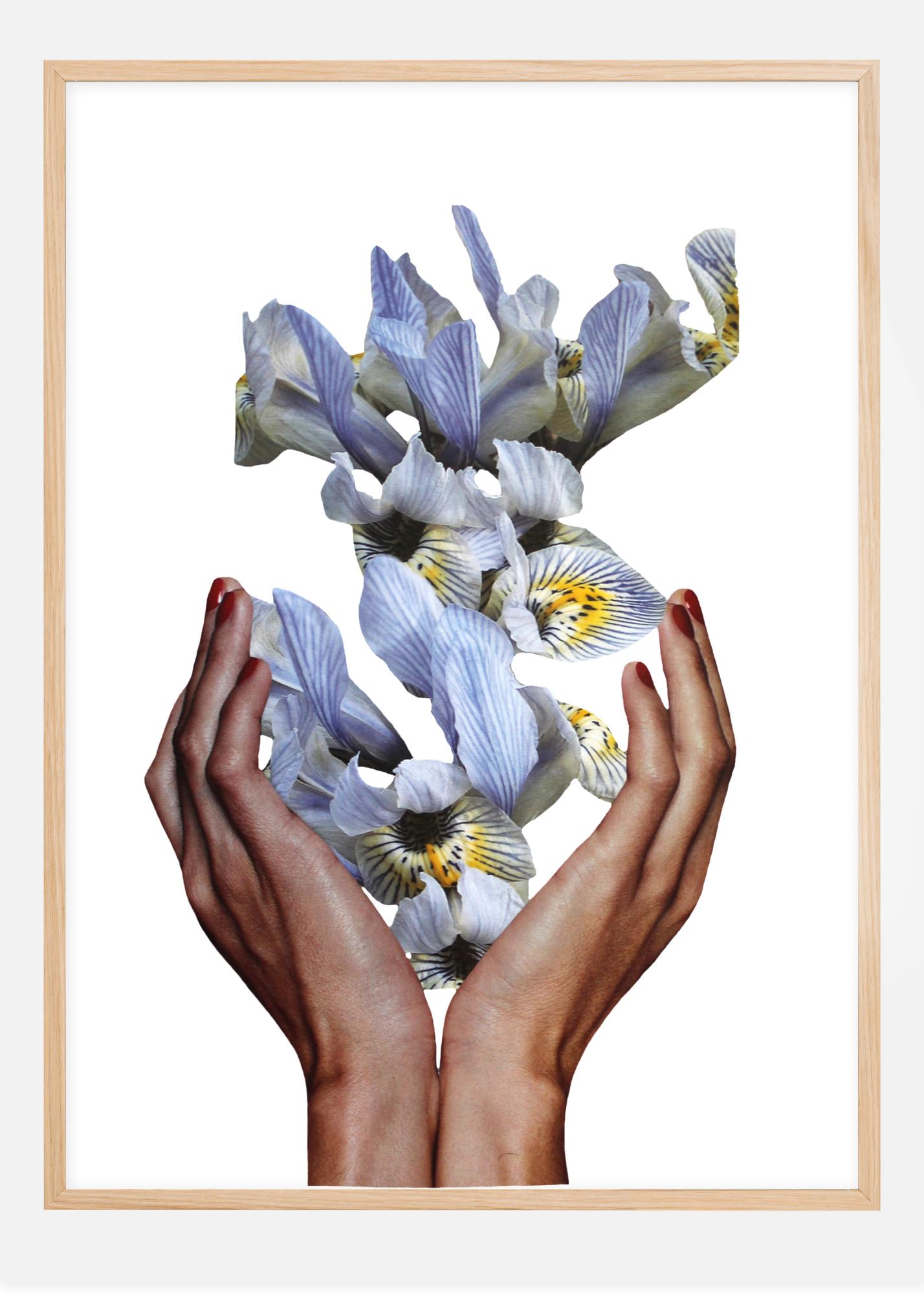 Μια όμορφη εικόνα λουλουδιών με ανοιχτό μωβ ίριδες. Τρυφερά ανοιχτά χέρια με όμορφα βαμμένα νύχια κρατούν απαλά τις ίριδες. Το λευκό φόντο ενισχύει τα απαλά μωβ και κίτρινα χρώματα και δημιουργεί μια λεπτή αλλά όμορφη εικόνα λουλουδιών. Μια χαλαρωτική αφίσα που ζωντανεύει έναν απλό λευκό τοίχο.