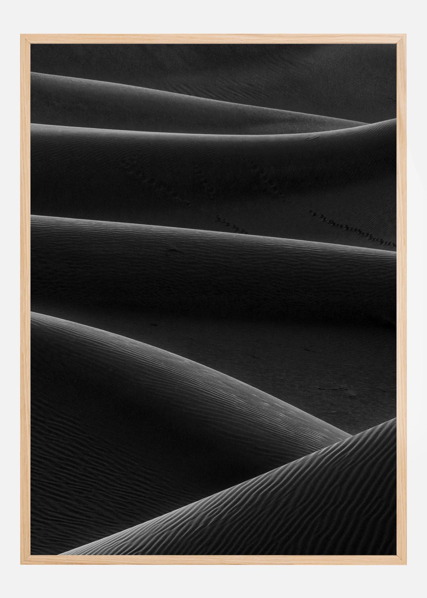 Μια φανταστική ασπρόμαυρη αφίσα με αμμόλοφους στην έρημο. Η κυματιστή άμμος αναδεικνύεται από το φυσικό φως που πέφτει πάνω στους αμμόλοφους και δημιουργεί ένα αποτέλεσμα από άκρες. Μια φανταστική αλλά ήσυχη εικόνα για να κρεμαστεί σε έναν λευκό τοίχο για να δώσει μια αίσθηση απείρου.