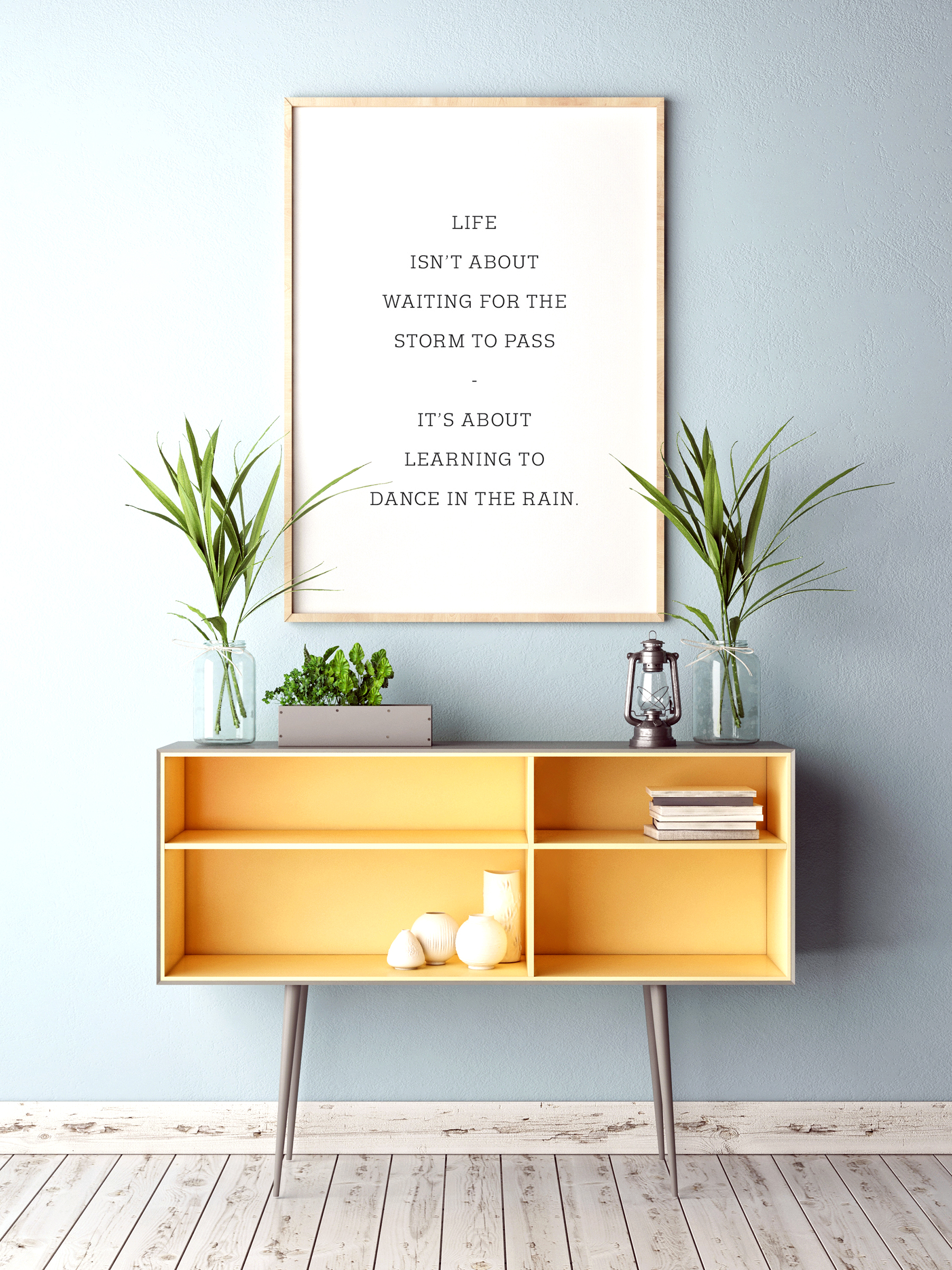 Ένα σημαντικό ασπρόμαυρο έργο τέχνης κινήτρου που υπογραμμίζει τη σημασία της αντιμετώπισης προβλημάτων. Γραμμένο με απλά έντονα μαύρα κεφαλαία, το μήνυμα μεταφέρεται καθαρά. Η ζωή δεν είναι να περιμένουμε να περάσει η καταιγίδα - είναι να μαθαίνουμε να χορεύουμε στη βροχή. Μια απλή αλλά μοντέρνα αφίσα για να κρεμαστεί σε έναν λευκό τοίχο.