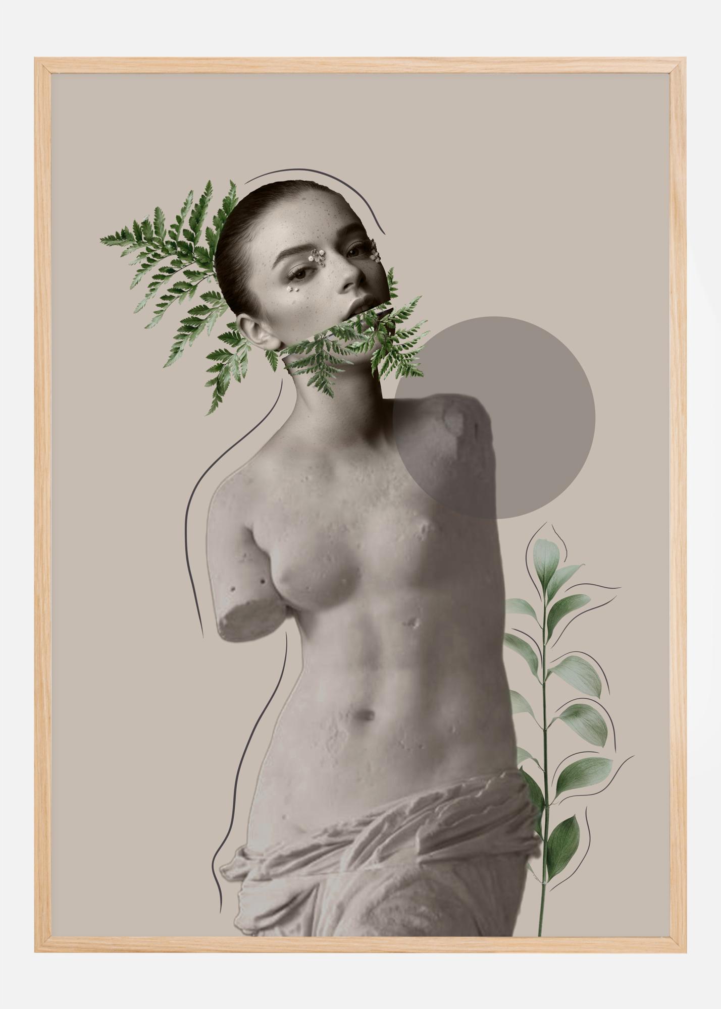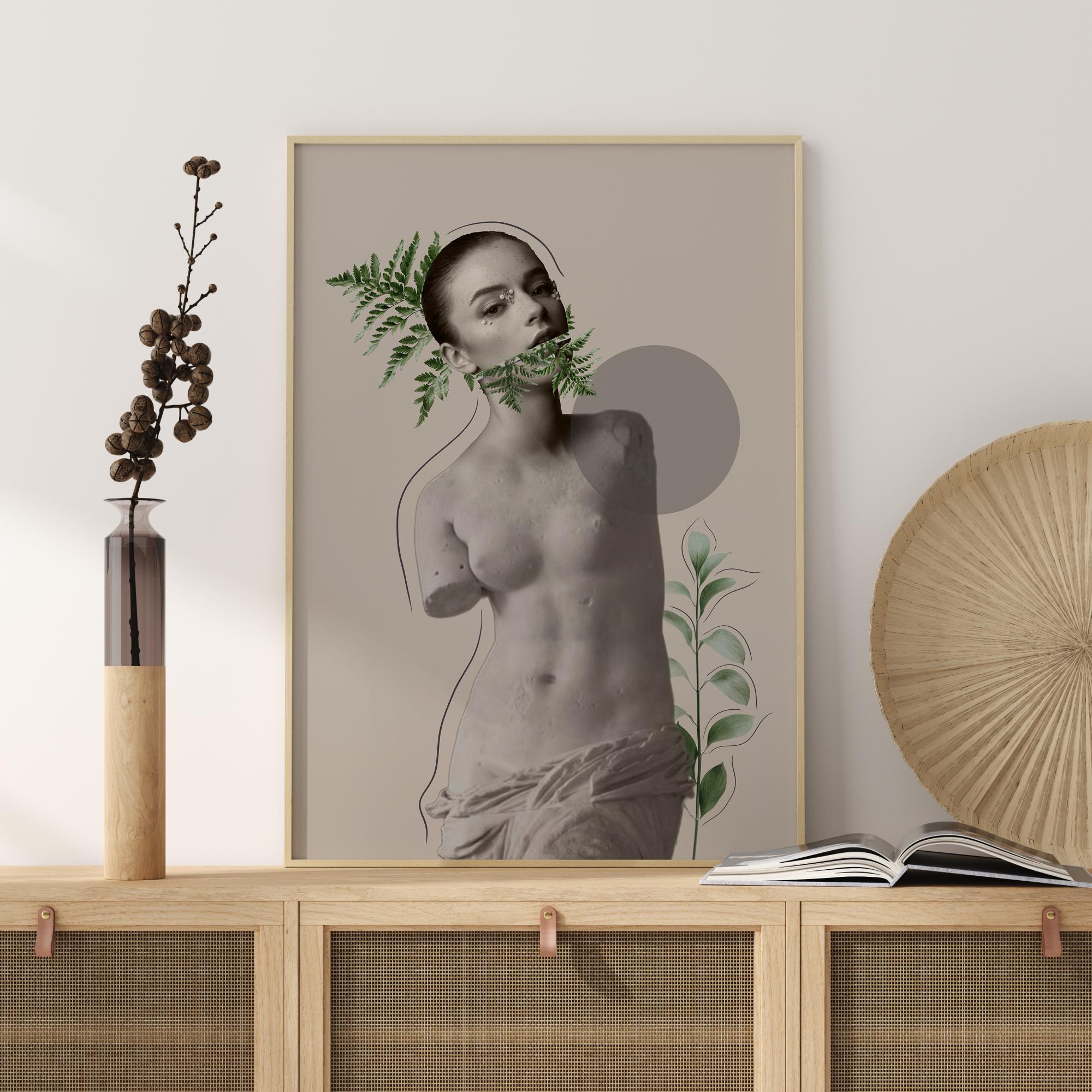 Μια εκφραστική αφίσα που αναδεικνύει την ομορφιά του θέματος μέσω του κολάζ. Ο κύριος χαρακτήρας είναι μια όμορφη γυναίκα που περιβάλλεται από βλάστηση σε ένα παλιό ελληνικό άγαλμα. Μια διακριτική αντίθεση μεταξύ του σύγχρονου και του αρχαίου. Αυτή η εικόνα είναι μια ισχυρή έκφραση για ένα μινιμαλιστικό σαλόνι.