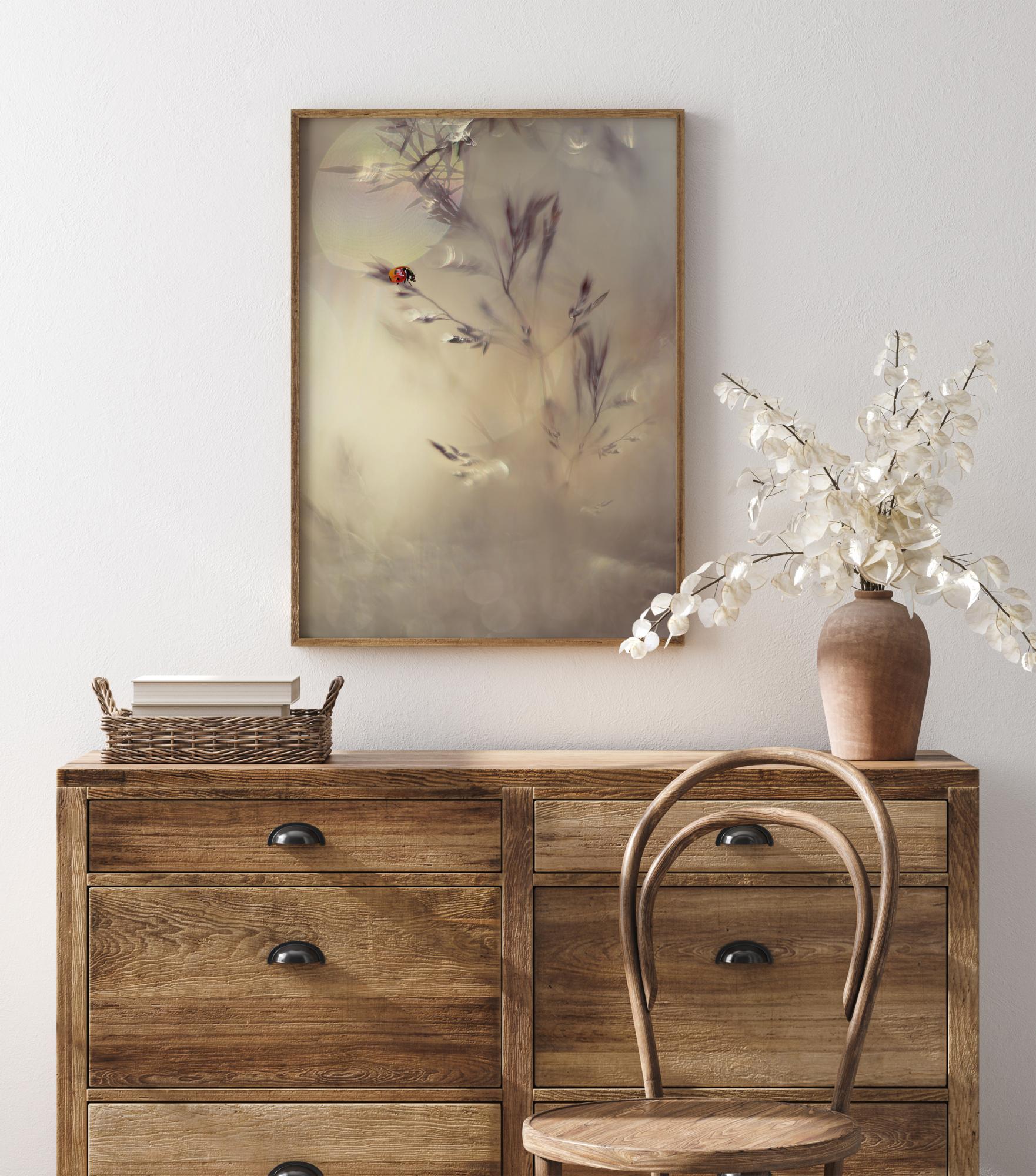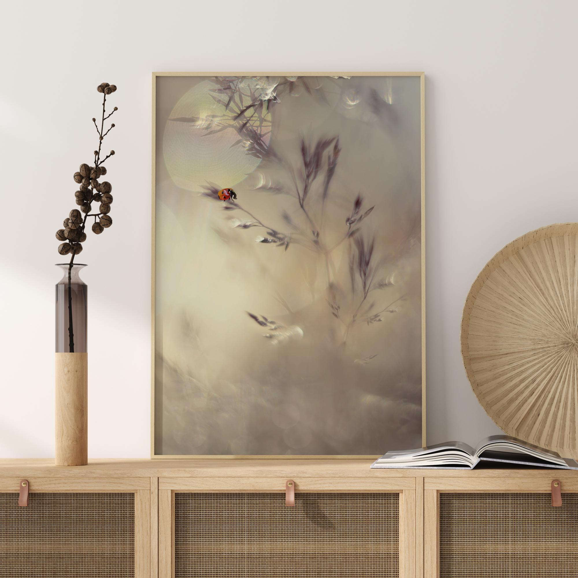 Μια ομιχλώδης αφίσα με μια όμορφη πασχαλίτσα πάνω σε ένα αποξηραμένο χορτάρι. Με το ηλιακό φως που αντανακλάται στο βάθος, τα έντονα μαύρα και κόκκινα χρώματα της πασχαλίτσας ξεχωρίζουν καθαρά. Τα όμορφα, ομιχλώδη χρώματα προσφέρουν μια αίσθηση ειρήνης και ηρεμίας. Ένα όμορφο τύπωμα για να κρεμαστεί σε μια κρεβατοκάμαρα.