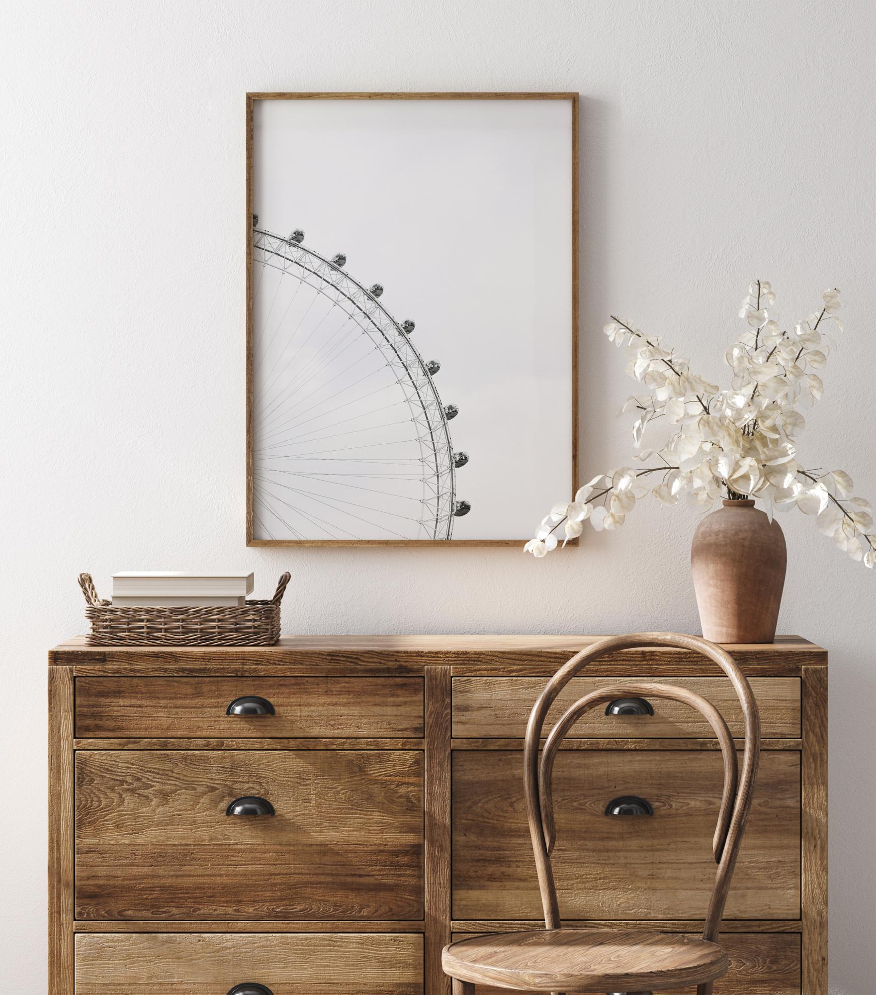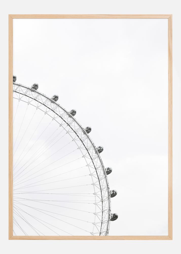 Ένα εντυπωσιακό ασπρόμαυρο εκτύπωμα του London Eye. Με τον γκρίζο ουρανό του Λονδίνου στο φόντο, οι ακτίνες του τροχού καθοδηγούν το βλέμμα προς τις εννέα καμπίνες επιβατών. Μια πραγματικά εντυπωσιακή αφίσα που αναδεικνύει αυτή τη μεγαλοπρεπή τεχνική κατασκευή. Φανταστείτε την θέα από μία από αυτές τις καμπίνες.