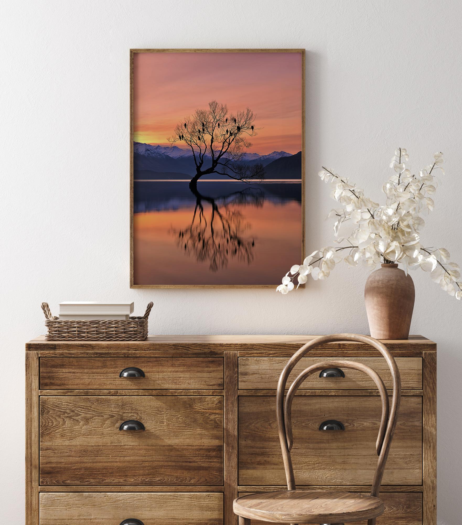 Μια όμορφη αφίσα φύσης με ένα μοναχικό δέντρο στη μέση μιας λίμνης. Με πουλιά που κάθονται ήσυχα στα κλαδιά, αυτή η εκτύπωση σε παστέλ χρώματα αντικατοπτρίζει το δέντρο στη λίμνη και δημιουργεί ένα τέλειο καθρέφτισμα τόσο της φύσης όσο και των χρωμάτων. Ακούστε τη σιωπή σε αυτήν την κατευναστική εικόνα.