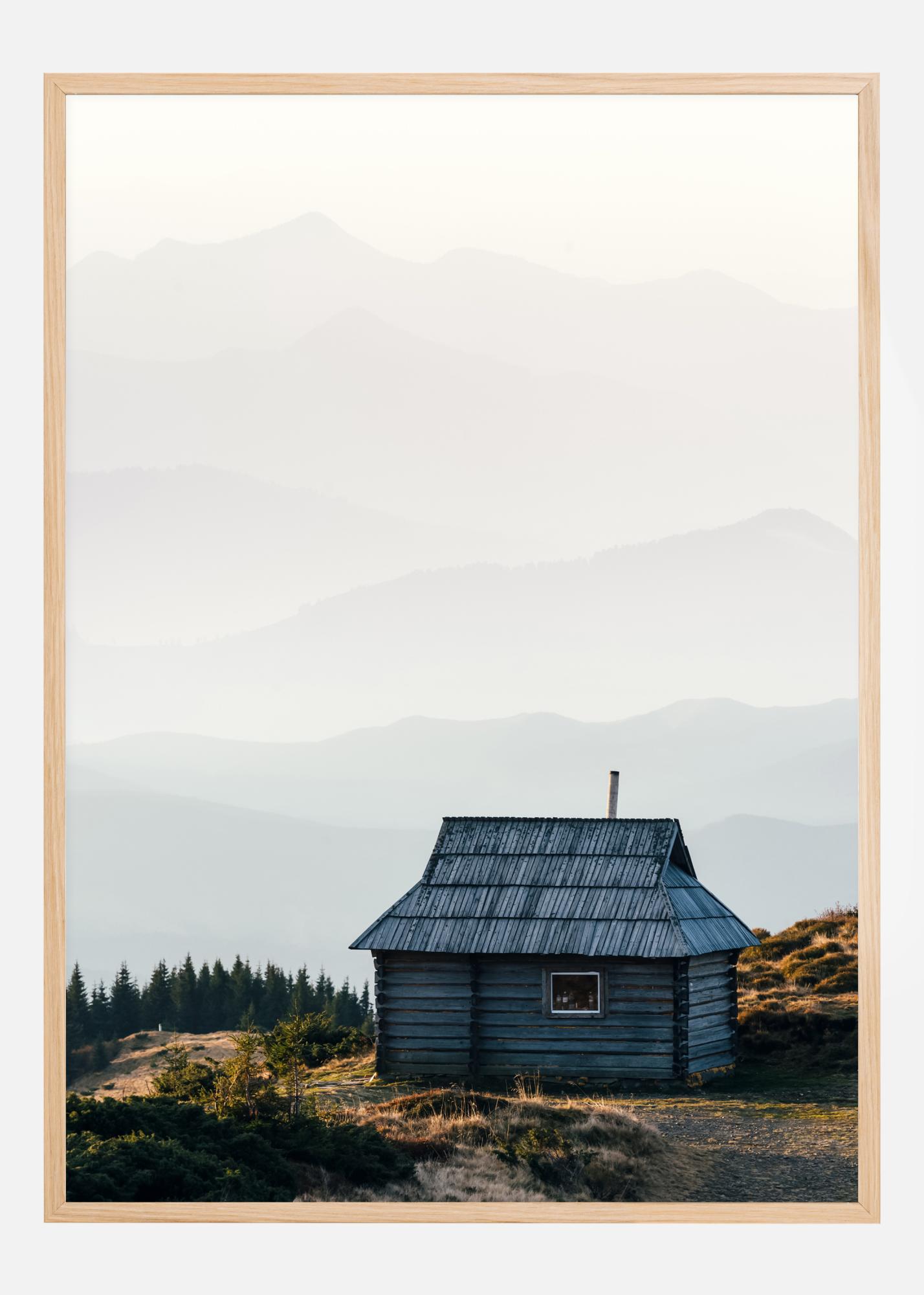 Μια απλή, μικρή μπλε καλύβα στην κορυφή ενός βουνού. Οι απομακρυσμένοι λόφοι στο θολό υπόβαθρο δημιουργούν μια μαγική εικόνα. Αριστερά της καλύβας, τα σκούρα πράσινα πεύκα προσθέτουν χρώμα σε αυτήν την απλή αλλά όμορφη αφίσα. Κρεμάστε την σε έναν φωτεινό τοίχο για να δώσετε μια αίσθηση χώρου.