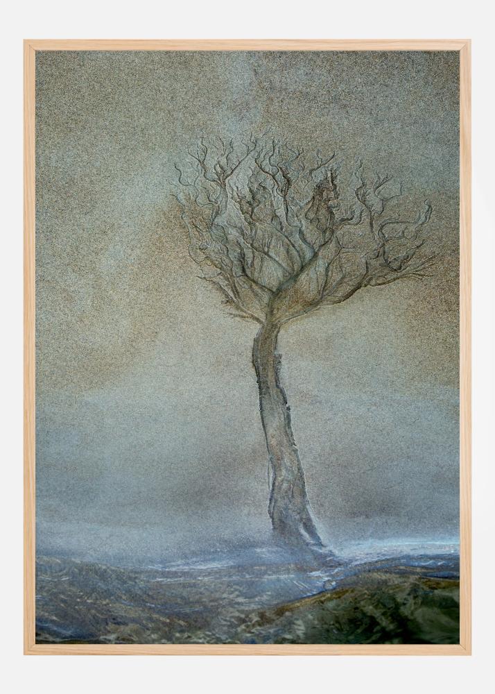 Μια αφίσα τοπίου με ένα μελαγχολικό μοναχικό δέντρο. Η εκτύπωση απεικονίζει μια ωχρή πανοραμική θέα των πεδιάδων με τους λόφους στο προσκήνιο. Ένα μοναχικό δέντρο χωρίς φύλλα κυριαρχεί στο προσκήνιο. Τα απαλά γκρι και καφέ χρώματα δημιουργούν μια μελαγχολική και χαμένη αίσθηση. Κρεμάστε αυτή την εκτύπωση σε έναν ήρεμο χώρο.