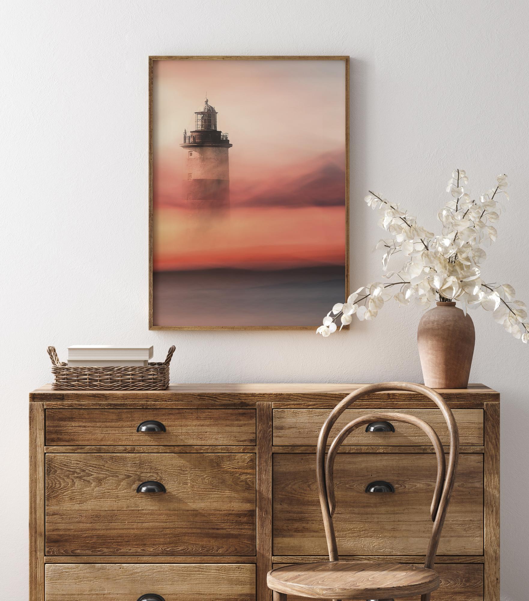 Μια όμορφη ρομαντική εκτύπωση ενός φάρου στην ομίχλη της θάλασσας. Τα απαλό ροζ παστέλ χρώματα δημιουργούν μια αίσθηση ρομαντισμού, ενώ η απαλή μπλε θάλασσα δίνει έναν πιο σκοτεινό τόνο σε αυτή την όμορφη αφίσα. Νιώστε και ακούστε την αύρα της θάλασσας όταν κρεμάσετε αυτή την εικόνα στο σπίτι σας.
