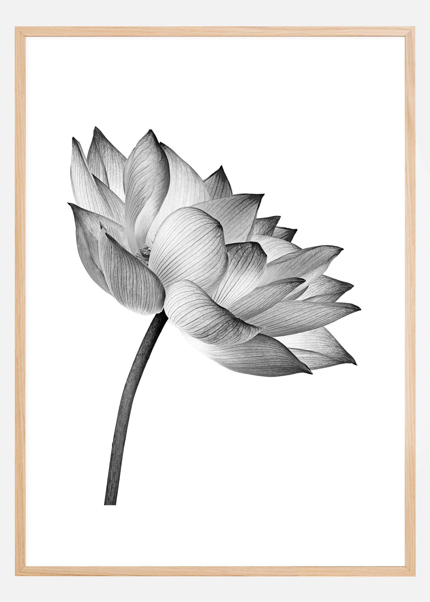 Μια γραφική αφίσα σε ασπρόμαυρο με ένα ανοικτό άνθος λωτού σε λευκό φόντο. Μια κομψή και μινιμαλιστική αφίσα που είναι εύκολο να συνδυαστεί με άλλες αγαπημένες σε έναν μεγαλύτερο τοίχο με κορνίζες.