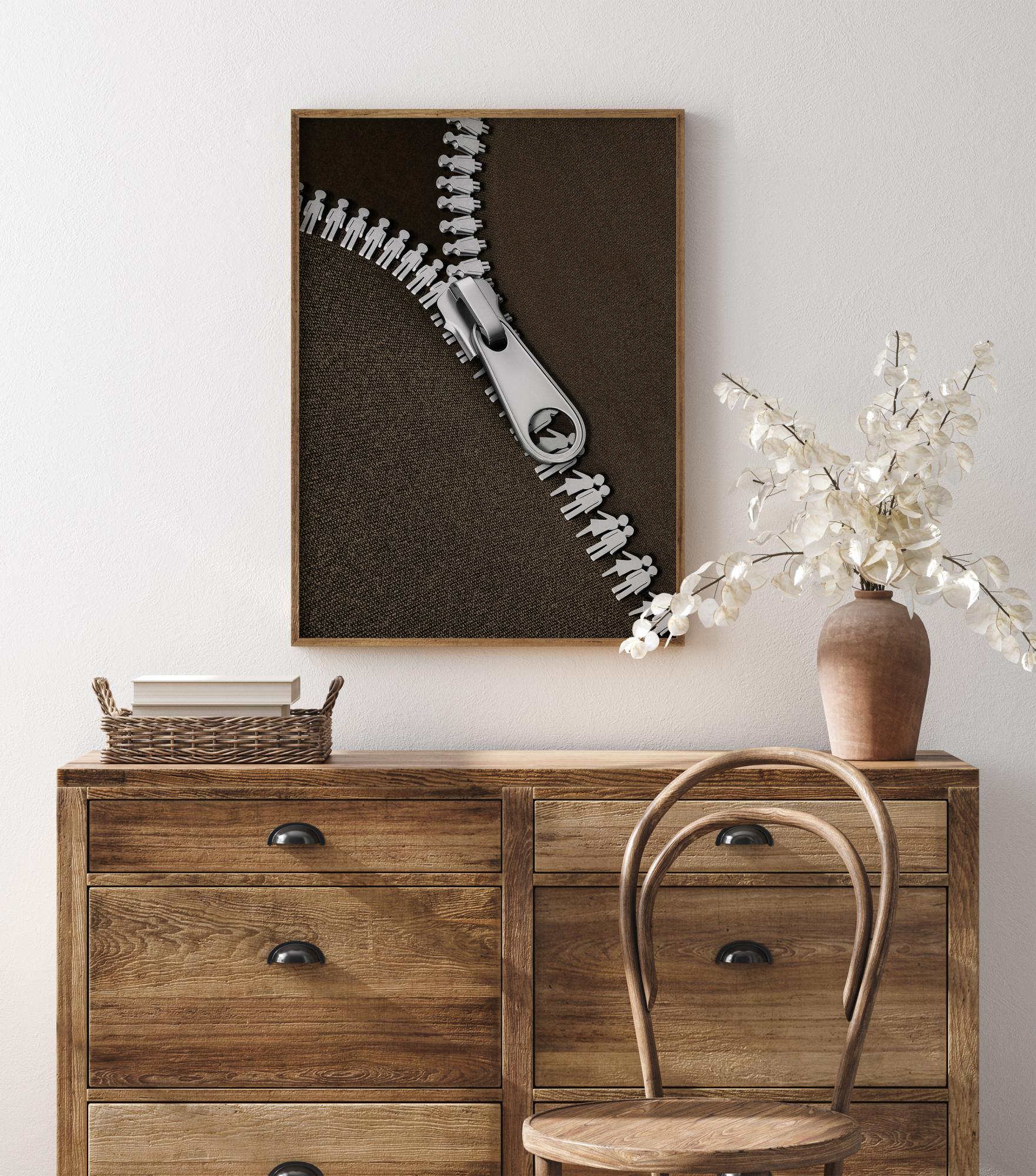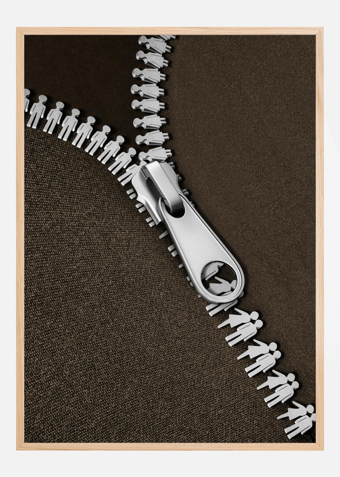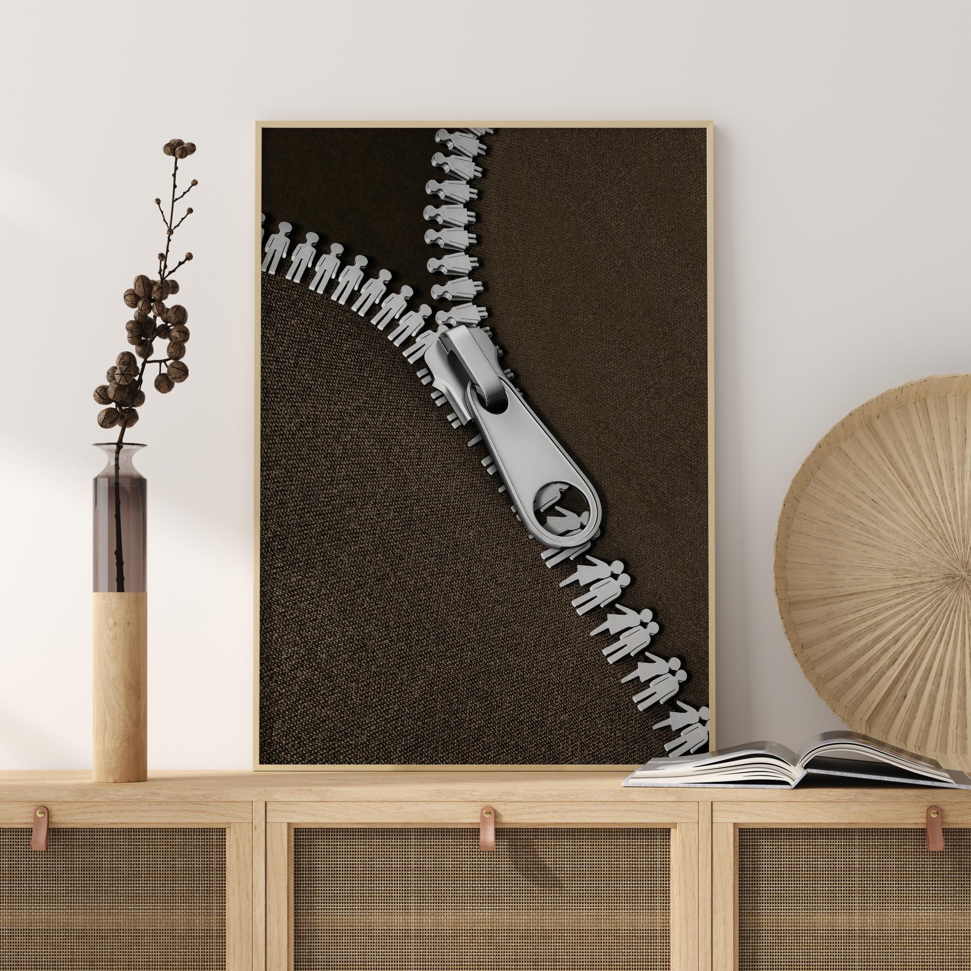 Ένα μινιμαλιστικό σχέδιο με ασημένιο φερμουάρ. Το ασημένιο φερμουάρ σε μαύρο φόντο απεικονίζει δύο εραστές που συναντιούνται. Σε ένα σκούρο καφέ ύφασμα κρέμεται το ασημένιο κούμπωμα πάνω από τις φιγούρες του φερμουάρ. Μια διασκεδαστική αφίσα για όλους όσοι ενδιαφέρονται για τη μόδα.