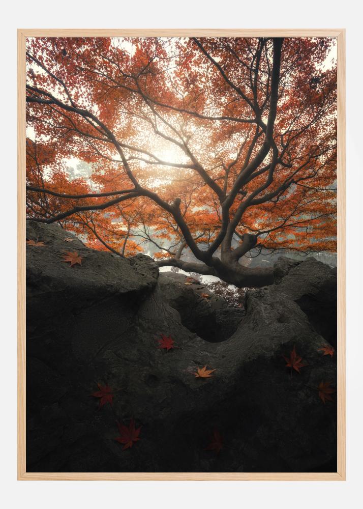 Μια συναρπαστική αφίσα φύσης με ένα όμορφο, πορτοκαλί σφενδάμι. Φωτογραφημένο από την οπτική γωνία ενός βατράχου, το ισχυρό ηλιακό φως ακτινοβολεί μέσα από τα κλαδιά, δημιουργώντας μια ζεστή και χαλαρή αίσθηση. Στο προσκήνιο, μερικά κόκκινα και πορτοκαλί φύλλα έχουν πέσει σε έναν κορμό. Προσθέστε μια πινελιά φύσης με αυτήν την εκτύπωση στο σπίτι σας.