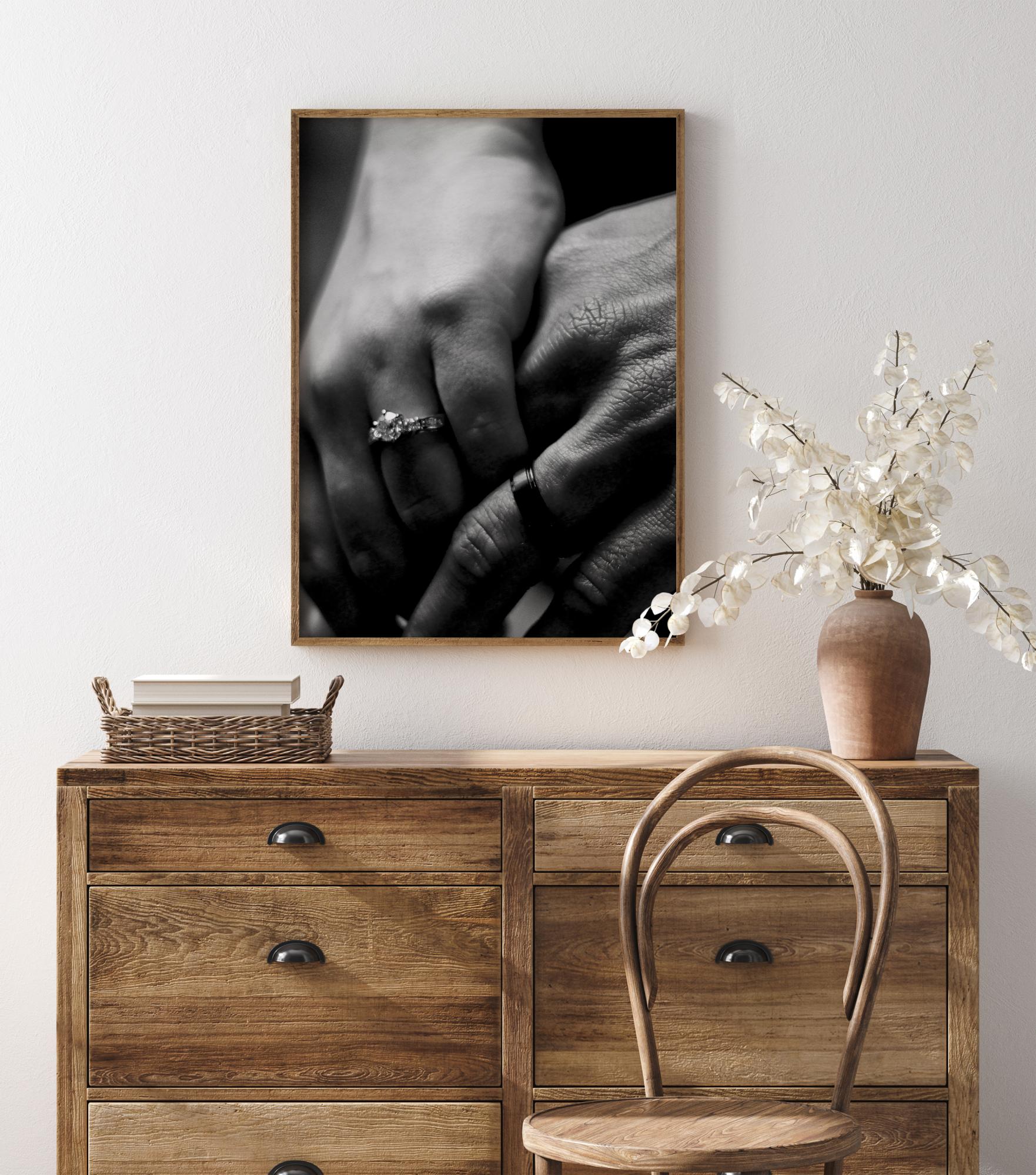 Ένα ρομαντικό ασπρόμαυρο τύπωμα δύο χεριών που φορούν δαχτυλίδια. Μια δυνατή και συναισθηματική εικόνα σε σκοτεινό φόντο. Το φυσικό φως φωτίζει το μικρό δαχτυλίδι που μοιάζει με διαμάντι. Μια ρομαντική αφίσα για να κρεμαστεί σε έναν τοίχο σε ένα υπνοδωμάτιο.