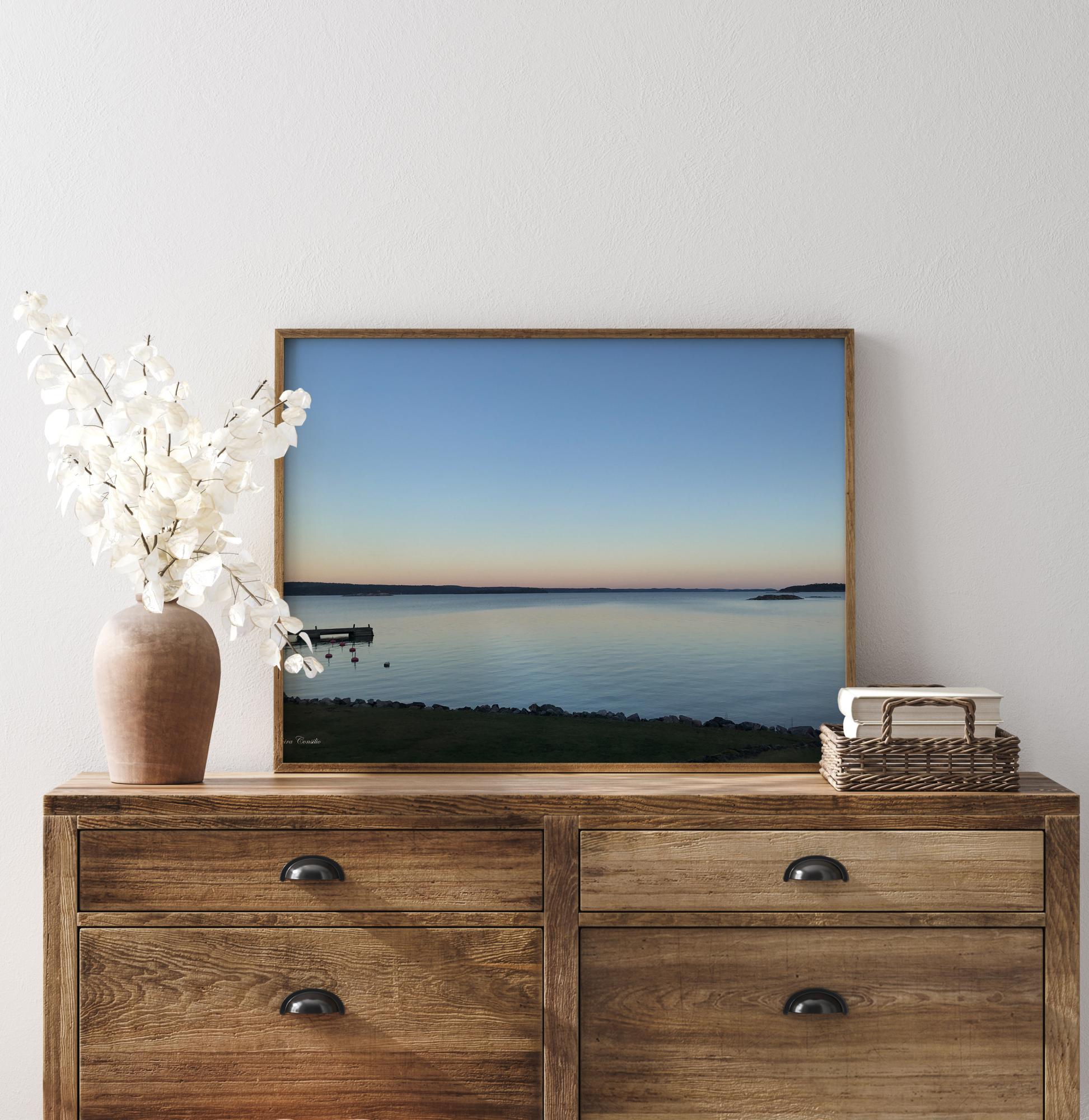Μια φωτογραφική αφίσα του σουηδικού αρχιπελάγους με τα νησιά και τους υφάλους του σε όμορφο ηλιοβασίλεμα. Μια αποβάθρα με τις παρακείμενες πλωτές σημαδούρες δίνει λίγη επιπλέον ζωντάνια στην εικόνα. Μια υπέροχα χαλαρωτική αφίσα που δημιουργήθηκε από τη φωτογράφο Saphira Consilio.