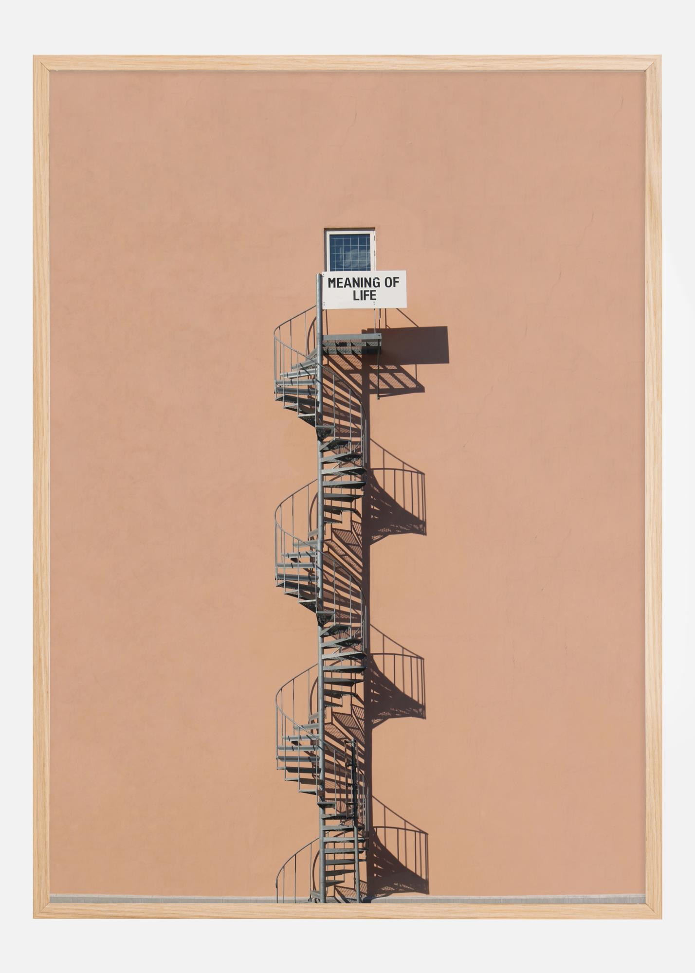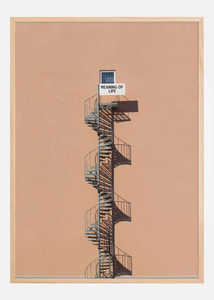 Ενάντια στο μινιμαλιστικό, ομοιόχρωμο φόντο, η σκάλα ξεχωρίζει ως μια δομή που είναι τόσο φυσική όσο και συμβολική, όπου κάθε βήμα μπορεί να αντιπροσωπεύει μια εμπειρία, μια μάθηση ή μια περίοδο στη ζωή. Η τοποθέτηση της πινακίδας στην κορυφή υποδηλώνει ότι το νόημα της ζωής μπορεί να είναι κάτι που συνεχώς επιδιώκουμε, αλλά ίσως ποτέ δεν μπορούμε να το κατανοήσουμε ή να το αγγίξουμε πλήρως.