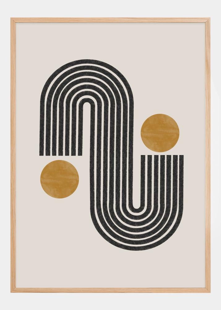 Ανακαλύψτε έναν κόσμο κομψής ομορφιάς με την αφίσα μας, που αναδεικνύει τις αντιθέσεις μέσω τόσο της μορφής όσο και του χρώματος. Αυτό το έργο παρουσιάζει ένα δυναμικό ασπρόμαυρο μοτίβο από γραμμές που σχηματίζουν μια απαλή καμπύλη, ισορροπημένη με δύο κύκλους σε απόχρωση όχρας που προσδίδουν μια ζεστή και γήινη αίσθηση. Αυτός ο μινιμαλιστικός αλλά εντυπωσιακός σχεδιασμός είναι εμπνευσμένος από την αισθητική της μοντέρνας μέσης του αιώνα και προσφέρει μια αίσθηση ηρεμίας και ισορροπίας σε κάθε χώρο που τοποθετείται.