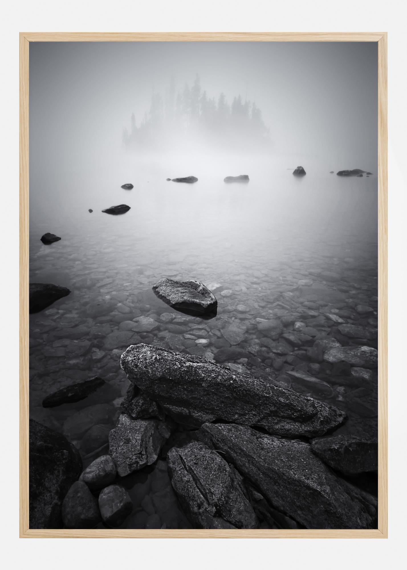 Μια μυστηριώδης αφίσα φύσης με πέτρες και μια ομιχλώδη λίμνη. Φανταστείτε τι υπάρχει εκεί έξω όταν κοιτάζετε το ομιχλώδες νησί καλυμμένο με δέντρα. Κάντε το σπίτι σας μαγικό με αυτή την εκπληκτική εκτύπωση σε έναν μπλε τοίχο.